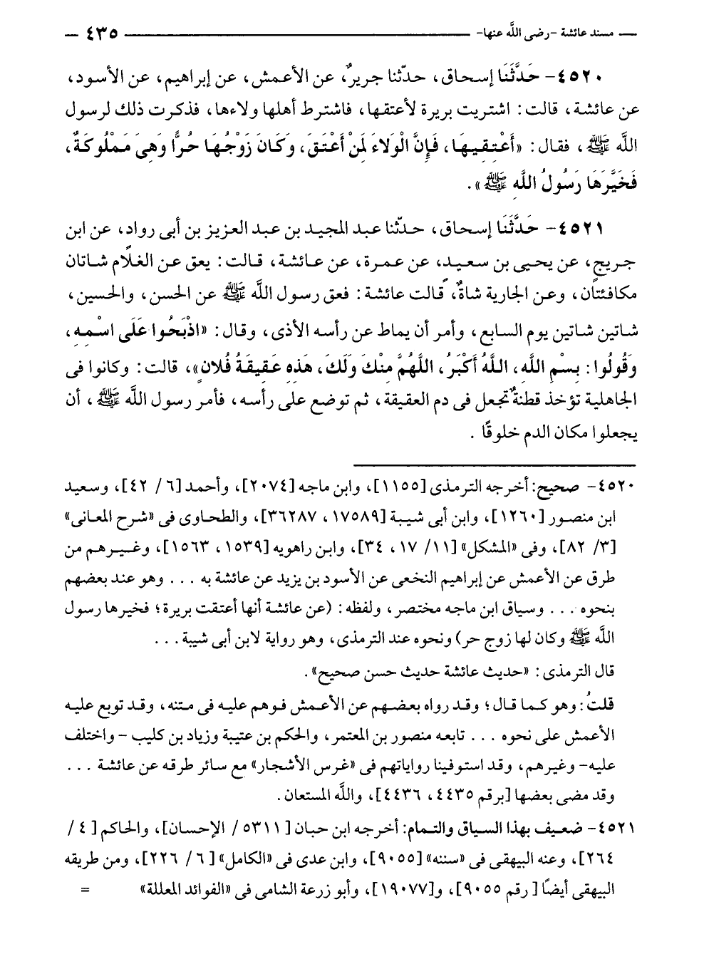 ٤٥٢١ - حَدَّثَنَا إسحاق، حدّثنا عبد المجيد بن عبد العزيز بن أبى روادٍ، عن ابن جريجٍ، عن يحيى بن سعيدٍ، عن عمرة، عن عائشة، قالت: يعق عن الغلام شاتان مكافئتان، وعن الجارية شاةٌ، قالت عائشة: فعق رسول الله - صلى الله عليه وسلم - عن الحسن، والحسين، شاتين شاتين يوم السابع، وأمر أن يماط عن رأسه الأذى، وقال: "اذْبَحُوا عَلَى اسْمِهِ، وَقُولُوا: بِسْمِ الله، اللهُ أَكْبَرُ، اللَّهُمَّ مِنْكَ وَلَكَ، هَذِهِ عَقِيقَةُ فُلانٍ"، قالت: وكانوا في الجاهلية تؤخذ قطنةٌ تجعل في دم العقيقة، ثم توضع على رأَسه، فأمر رسول الله - صلى الله عليه وسلم -، أن يجعلوا مكان الدم خلوقًا.