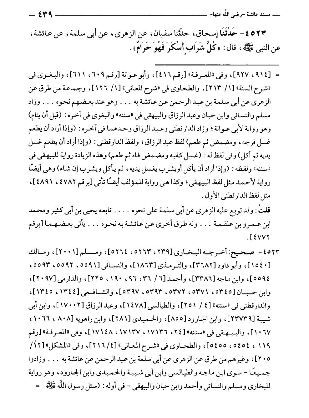 ٤٥٢٣ - حَدَّثَنَا إسحاق، حدّثنا سفيان، عن الزهرى، عن أبى سلمة، عن عائشة، عن النبي - صلى الله عليه وسلم -، قال: "كُلُّ شَرَابٍ أَسْكَرَ فَهُوَ حَرَامٌ".