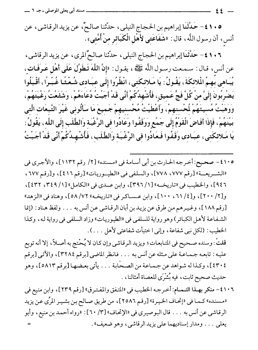 ٤١٠٥ - حَدَّثَنَا إبراهيم بن الحجاج النيلى، حدّثنا صالحٌ، عن يزيد الرقاشي، عن أنسٍ، أن رسول الله، قال: "شَفَاعَتِى لأَهْلِ الْكَبَائِرِ مِنْ أُمَّتِى".