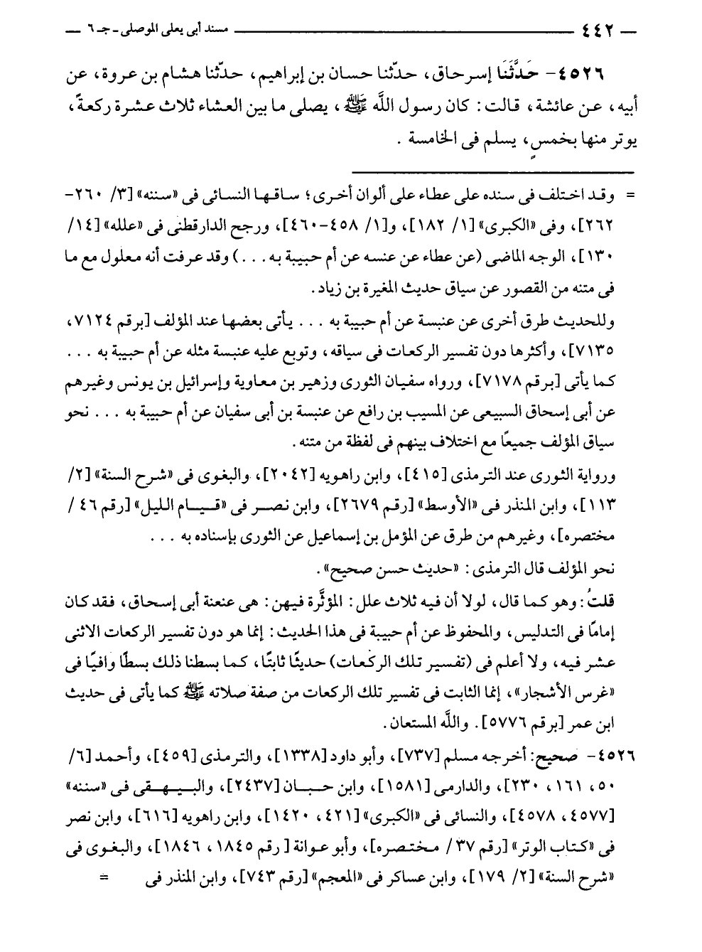٤٥٢٦ - حَدَّثَنَا إسحاق، حدّثنا حسان بن إبراهيم، حدّثنا هشام بن عروة، عن أبيه، عن عائشة، قالت: كان رسول الله - صلى الله عليه وسلم -، يصلى ما بين العشاء ثلاث عشرة ركعةً، يوتر منها بخمسٍ، يسلم في الخامسة.