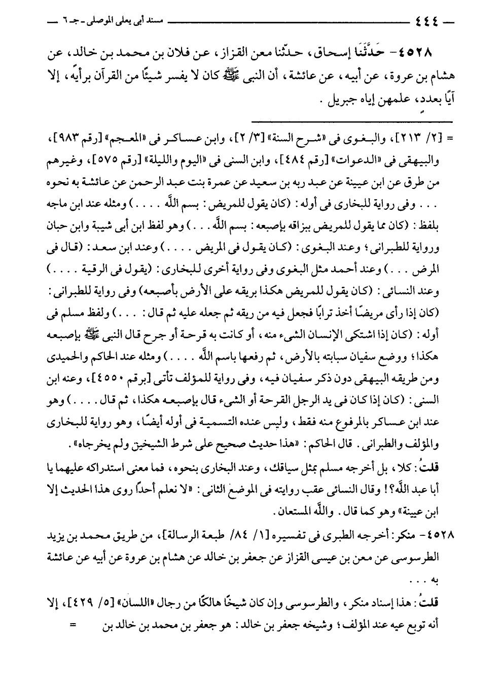 ٤٥٢٨ - حَدَّثَنَا إسحاق، حدّثنا معن القزاز، عن فلان بن محمد بن خالدٍ، عن هشام بن عروة، عن أبيه، عن عائشة، أن النبي - صلى الله عليه وسلم - كان لا يفسر شيئًا من القرآن برأيه، إلا آيًا بعددٍ، علمهن إياه جبريل.
