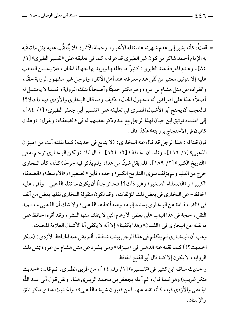 = قلتُ: كأنه يشير إلى عدم شهرته عند نقله الأخبار، وحملة الآثار؛ فلا يُتَعقَّب عليه بمثل ما تعقبه به الإمام أحمد شاكر من كون غير الطبرى قد عرفه، كما في تعليقه على "تفسير الطبرى" [١/ ٨٤]، وعدم المعرفة عند الطبرى: كثيرًا ما يطلقها ويريد بها جهالة الحال، فلا يحسن التعقب عليه إلا بتوثيق معتبر لمن نَفَى عدم معرفته عند أهل الآثار، والرجل غير مشهور الرواية حقًا، وانفراده عن مثل هشام بن عروة وهو مكثر حديثًا وأصحابًا بتلك الرواية؛ فمما لا يحتمل له أصلًا، هذا على افتراض أنه مجهول الحال، فكيف وقد قال البخارى والأزدى فيه ما قالا؟! فالعجب أن يجنح أبو الأشبال المصرى في تعليقه على "تفسير أبى جعفر الطبرى" [١/ ٨٤]، إلى اعتماد توثيق ابن حبان لهذا الرجل مع عدم ذكر بعضهم له في "الضعفاء" ويقول: "وهذان كافيان في الاحتجاج بروايته" هكذا قال.