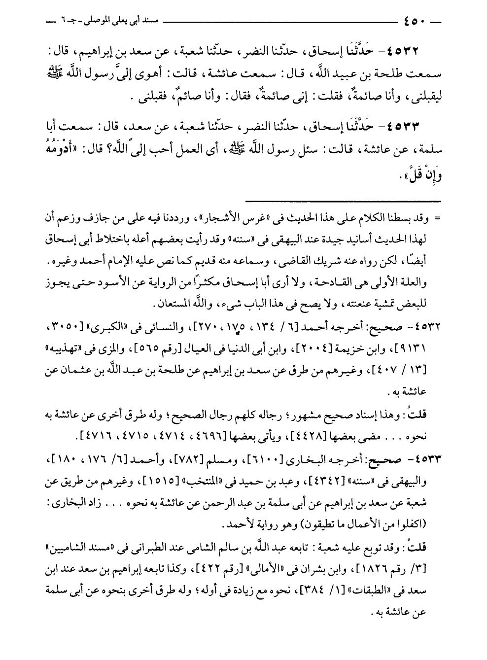 ٤٥٣٣ - حَدَّثَنَا إسحاق، حدّثنا النضر، حدّثنا شعبة، عن سعدٍ، قال: سمعت أبا سلمة، عن عائشة، قالت: سئل رسول الله - صلى الله عليه وسلم -، أي العمل أحب إلى الله؟ قال: "أَدْوَمُهُ وَإِنْ قَلَّ".