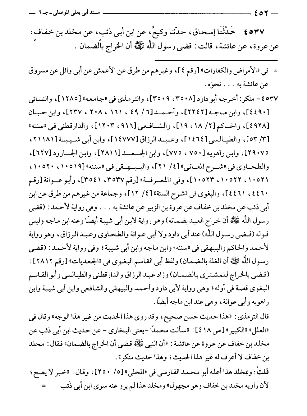 ٤٥٣٧ - منكر: أخرجه أبو داود [٣٥٠٨، ٣٥٠٩]، والترمذى في "جامعه" [١٢٨٥]، والنسائى [٤٤٩٠]، وابن ماجه [٢٢٤٢]، وأحمد [٦/ ٤٩، ١٦١، ٢٠٨، ٢٣٧]، وابن حبان [٤٩٢٨]، والحاكم [٢/ ١٨، ١٩]، والشافعى [٩١٦، ١٢٠٣]، والدارقطنى في "سننه" [٣/ ٥٣]، والطيالسى [١٤٦٤]، وعبد الرزاق [١٤٧٧٧]، وابن أبى شيبة [٢١١٨١، ٢٩٠٧٥]، وابن راهويه [٧٥٠، ٧٧٥]، وابن الجعد [٢٨١١]، وابن الجارود [٦٢٧]، والطحاوى في "شرح المعانى" [٤/ ٢١]، والبيهقى في "سننه" [١٠٥١٩، ١٠٥٢٠، ١٠٥٢١، ١٠٥٢٢، ١٠٥٢٣]، وفى "المعرفة" [رقم ٣٥٣٧، ٣٥٤١]، وأبو عوانة [رقم ٤٤٦٠، ٤٤٦١]، والبغوى في "شرح السنة" [٤/ ١٢]، وجماعة من غيرهم من طرق عن ابن أبى ذئب عن مخلد بن خفاف عروة بن الزبير عن عائشة به ... وفى رواية لأحمد: (قضى رسول الله - صلى الله عليه وسلم - أن خراج العبد بضمانه) وهو رواية لابن أبى شيبة أيضًا وعنه ابن ماجه وليس قوله (قضى رسول الله) عند أبى داود ولا أبى عوانة والطحاوى وعبد الرزاق، وهو رواية لأحمد والحاكم والبيهقى في "سننه" وابن ماجه وابن أبى شيبة؛ وفى رواية لأحمد: (قضى رسول الله - صلى الله عليه وسلم - أن الغلة بالضمان) ولفظ أبى القاسم البغوى في "الجعديات" [رقم ٢٨١٢]: (قضى بالخراج للمشترى بالضمان) وزاد عبد الرزاق والدارقطنى والطيالسى وأبو القاسم البغوى قصة في أوله؛ وهى رواية لأبى داود وأحمد والبيهقى والشافعى وابن أبى شيبة وابن راهويه وأبى عوانة، وهى عند ابن ماجه أيضًا.