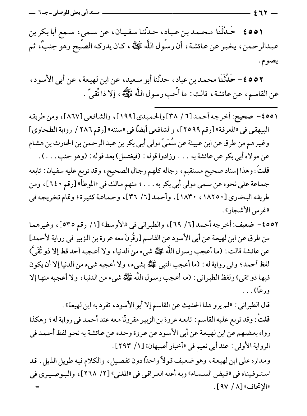 ٤٥٥٢ - ضعيف: أخرجه أحمد [٦/ ٦٩]، والطبرانى في "الأوسط" [١/ رقم ٥٣٥]، وغيرهما من طرق عن ابن لهيعة عن أبى الأسود عن القاسم [وقُرِنَ معه عروة بن الزبير في رواية لأحمد] عن عائشة قالت: (ما أعجب رسول الله - صلى الله عليه وسلم - شئ من الدنيا، ولا أعجبه أحد قط إلا ذو تُقَى) لفظ أحمد؛ وفى رواية له: (ما أعجب النبي - صلى الله عليه وسلم - بشئ، ولا أعجبه شئ من الدنيا إلا أن يكون فيها ذو تقى) ولفظ الطبراني: (ما أعجب رسول الله - صلى الله عليه وسلم - شئ من الدنيا، ولا أعجبه منها إلا ورعًا) ...