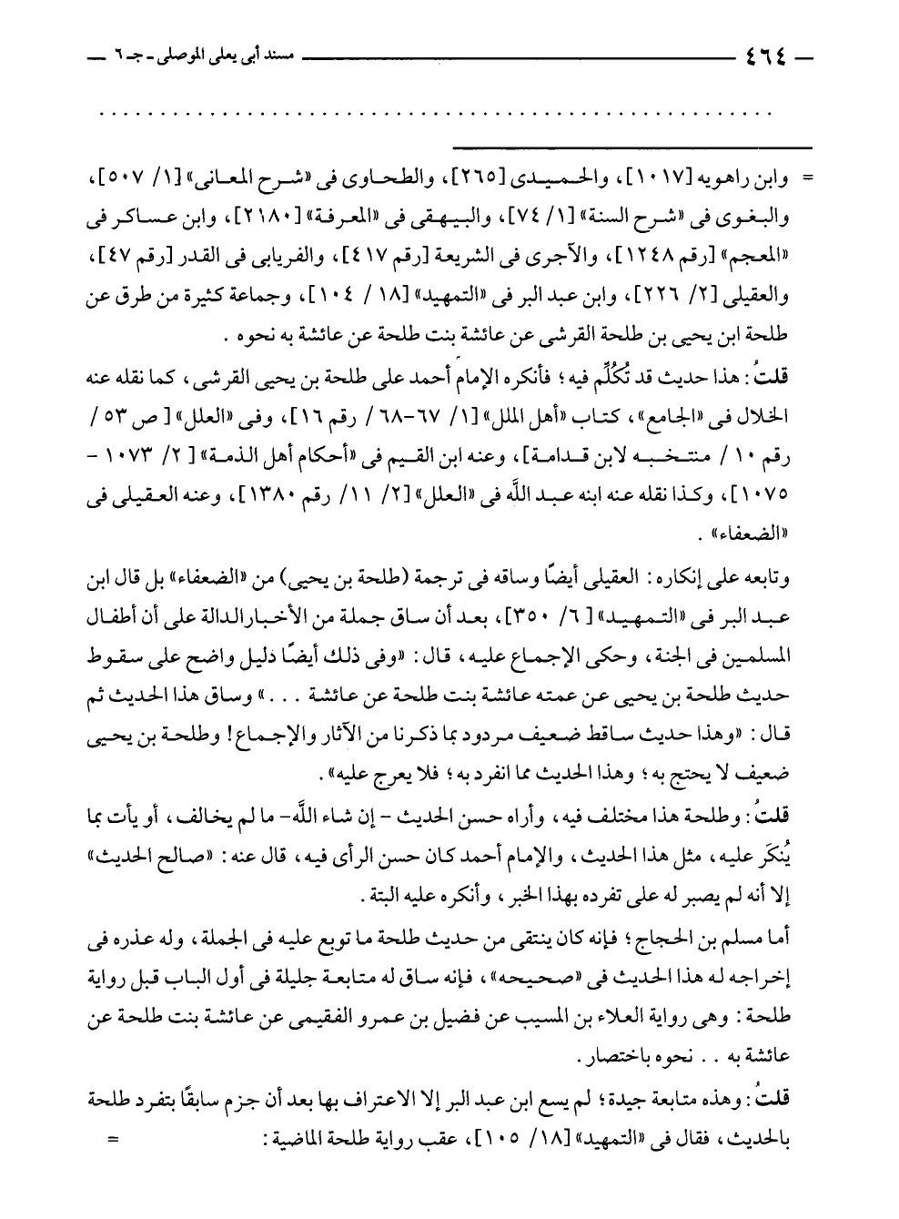 أما مسلم بن الحجاج؛ فإنه كان ينتقى من حديث طلحة ما توبع عليه في الجملة، وله عذره في إخراجه له هذا الحديث في "صحيحه"، فإنه ساق له متابعة جليلة في أول الباب قبل رواية طلحة: وهى رواية العلاء بن المسيب عن فضيل بن عمرو الفقيمى عن عائشة بنت طلحة عن عائشة به .. نحوه باختصار.