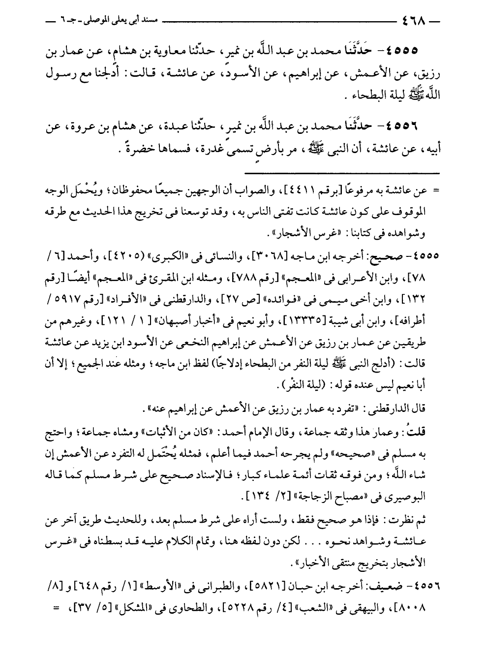 ٤٥٥٥ - حَدَّثَنَا محمد بن عبد الله بن نميرٍ، حَدَّثَنَا معاوية بن هشامٍ، عن عمار بن رزيق، عن الأعمش، عن إبراهيم، عن الأسود، عن عائشة، قالت: أدلجنا مع رسول الله - صلى الله عليه وسلم - ليلة البطحاء.