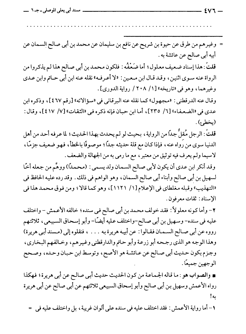 وقد أنكر ابن عدى أن يكون لأبى صالح السمان ولد يسمى: (محمدًا) ووهَّم من جعله أخًا لسهيل بن أبى صالح وأبناء أبى صالح السمان، وهو الواهم في ذلك. وقد رده عليه الحافظ في "التهذيب" وقبله مغلطاى في الإعلام [١/ ١١٢١]، وهو كما قالا؛ ومن فوق محمد هذا في الإسناد: ثقات معرفون.