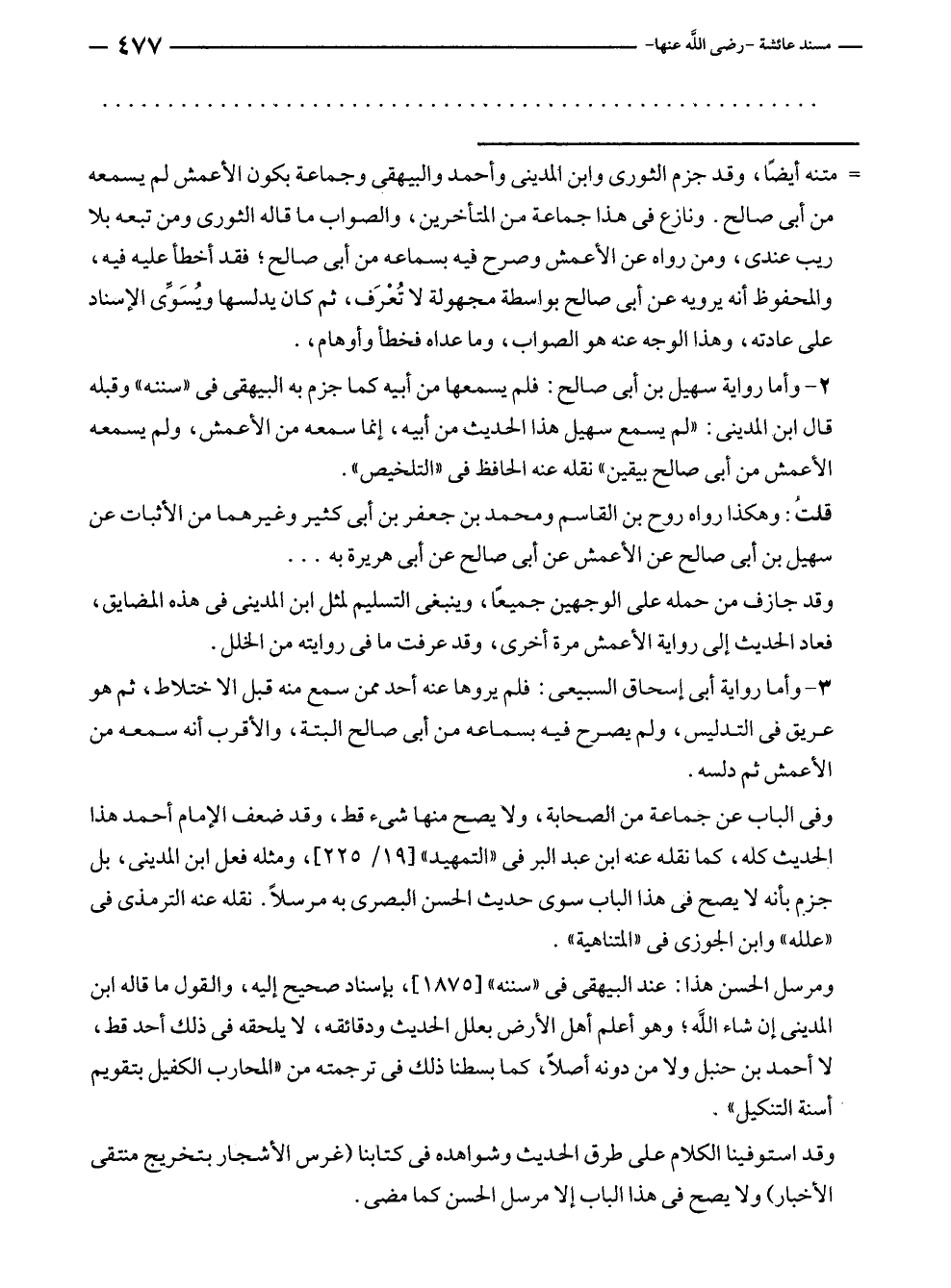 = متنه أيضًا، وقد جزم الثورى وابن المدينى وأحمد والبيهقى وجماعة بكون الأعمش لم يسمعه من أبى صالح. ونازع في هذا جماعة من المتأخرين، والصواب ما قاله الثورى ومن تبعه بلا ريب عندى، ومن رواه عن الأعمش وصرح فيه بسماعه من أبى صالح؛ فقد أخطأ عليه فيه، والمحفوظ أنه يرويه عن أبى صالح بواسطة مجهولة لا تُعْرَف، ثم كان يدلسها ويُسَوِّى الإسناد على عادته، وهذا الوجه عنه هو الصواب، وما عداه فخطأ وأوهام.