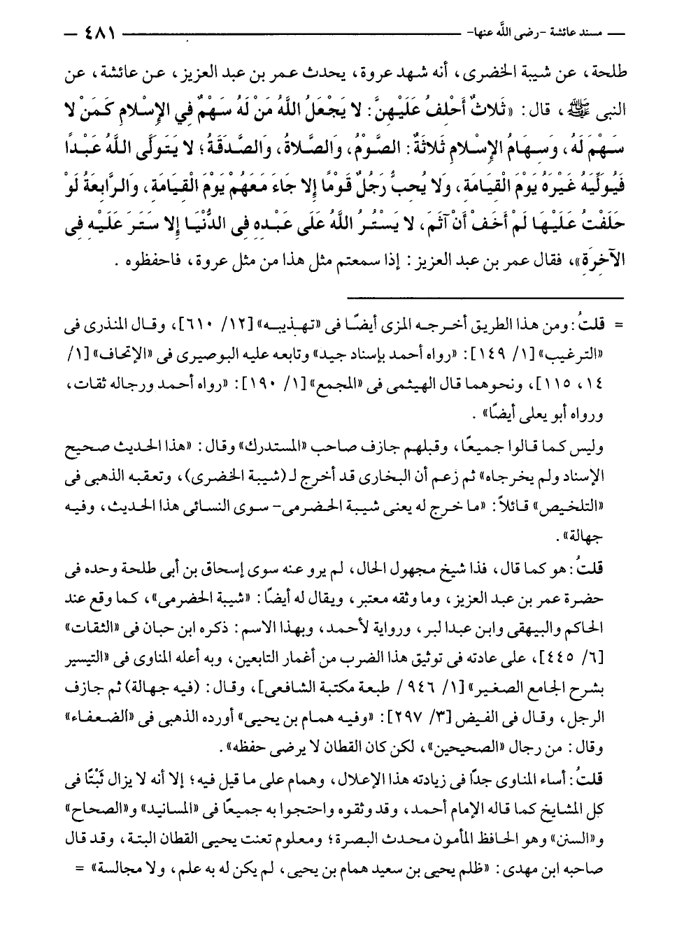 طلحة، عن شيبة الخضرى، أنه شهد عروة، يحدث عمر بن عبد العزيز، عن عائشة، عن النبي - صلى الله عليه وسلم -، قال: "ثَلاثٌ أَحْلِفُ عَلَيْهِنَّ: لا يَجْعَلُ اللَّهُ مَنْ لَهُ سَهْمٌ فِي الإسْلامِ كَمَنْ لا سَهْمَ لَهُ، وَسِهَامُ الإِسْلامِ ثَلاثَةٌ: الصَّوْمُ، وَالصَّلاةُ، وَالصَّدَقَةُ؛ لا يَتَوَلَّى اللَّهُ عَبْدًا فَيُوَلِّيَهُ غَيرَهُ يَوْمَ الْقِيَامَةِ، وَلا يُحِبُّ رَجُلٌ قَوْمًا إِلا جَاءَ مَعَهُمْ يَوْمَ الْقِيَامَةِ، وَالرَّابِعَةُ لَوْ حَلَفْتُ عَلَيْهَا لَمْ أَخَفْ أَنْ آثَمَ، لا يَسْتُرُ اللَّهُ عَلَى عَبْدِهِ فِي الدُّنْيَا إِلا سَتَرَ عَلَيْهِ فِي الآخِرَةِ"، فقال عمر بن عبد العزيز: إذا سمعتم مثل هذا من مثل عروة، فاحفظوه.