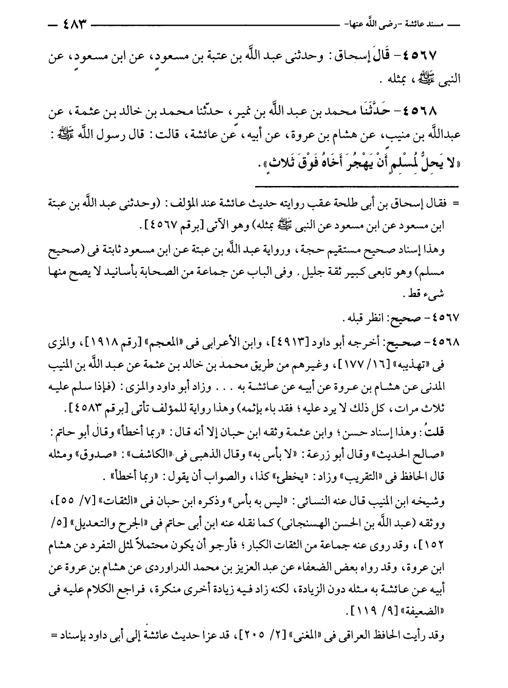 ٤٥٦٨ - حَدَّثَنَا محمد بن عبد الله بن نميرٍ، حَدَّثَنَا محمد بن خالد بن عثمة، عن عبد الله بن منيبٍ، عن هشام بن عروة، عن أبيه، عن عائشة، قالت: قال رسول الله - صلى الله عليه وسلم -: "لا يَحِلُّ لمُسْلِمٍ أَنْ يَهْجُرَ أَخَاهُ فَوْقَ ثَلاثٍ".