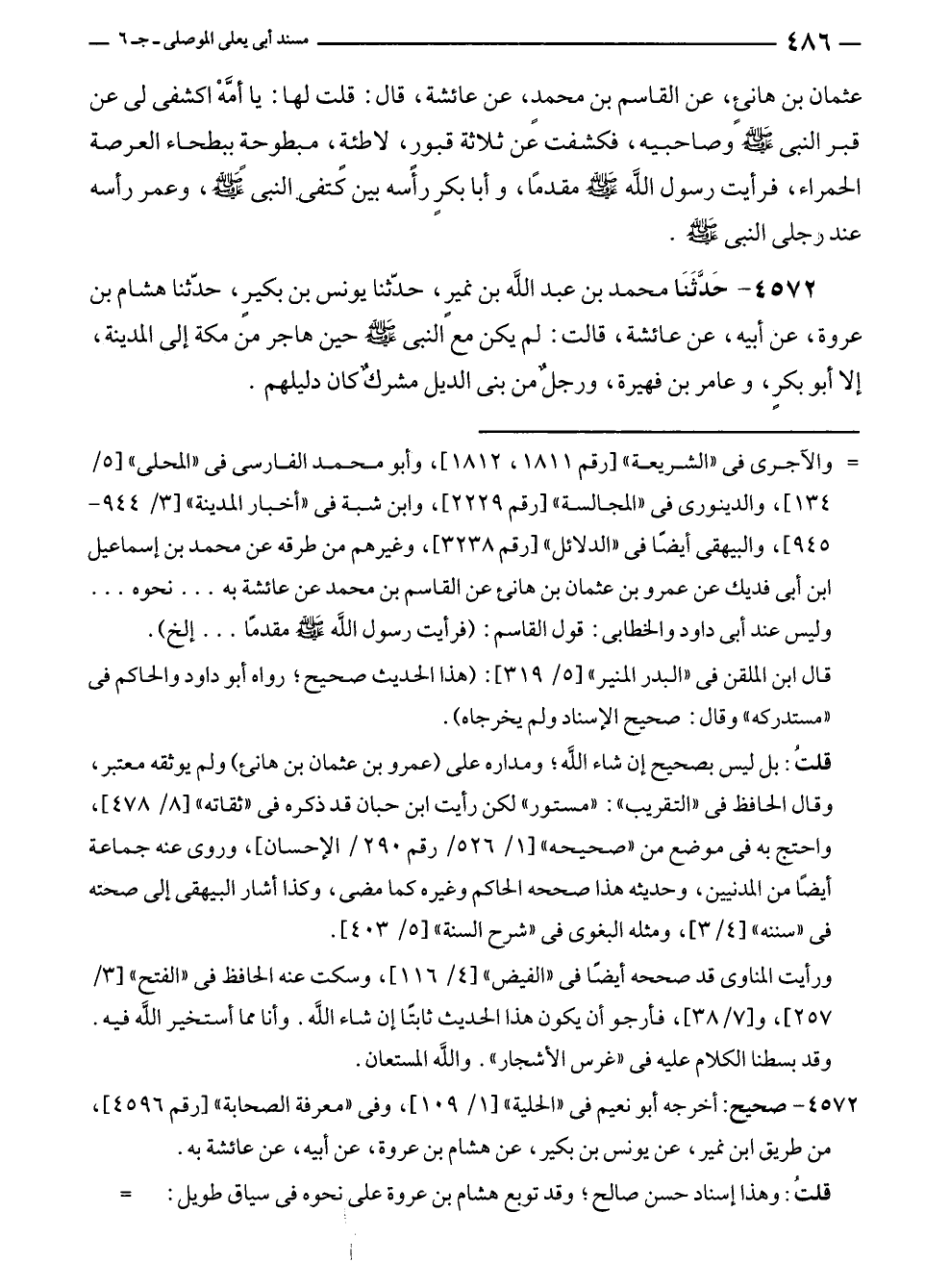 عثمان بن هانئ، عن القاسم بن محمدٍ، عن عائشة، قال: قلت لها: يا أمَّهْ اكشفى لى عن قبر النبي - صلى الله عليه وسلم - وصاحبيه، فكشفت عن ثلاثة قبور، لاطئةٍ، مبطوحة ببطحاء العرصة الحمراء، فرأيت رسول الله - صلى الله عليه وسلم - مقدمًا، وأبا بكر رأسه بين كتفى النبي - صلى الله عليه وسلم -، وعمر رأسه عند رجل النبي - صلى الله عليه وسلم -.