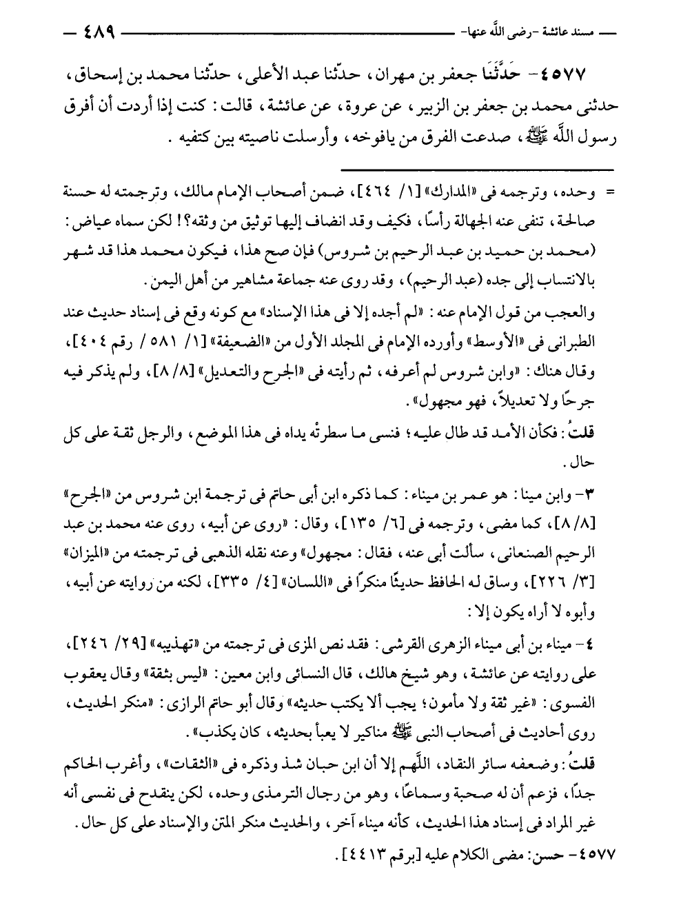 ٤٥٧٧ - حَدَّثَنَا جعفر بن مهران، حَدَّثَنَا عبد الأعلى، حَدَّثَنَا محمد بن إسحاق، حدثنى محمد بن جعفر بن الزبير، عن عروة، عن عائشة، قالت: كنت إذا أردت أن أفرق رسول الله - صلى الله عليه وسلم -، صدعت الفرق من يافوخه، وأرسلت ناصيته بين كتفيه.