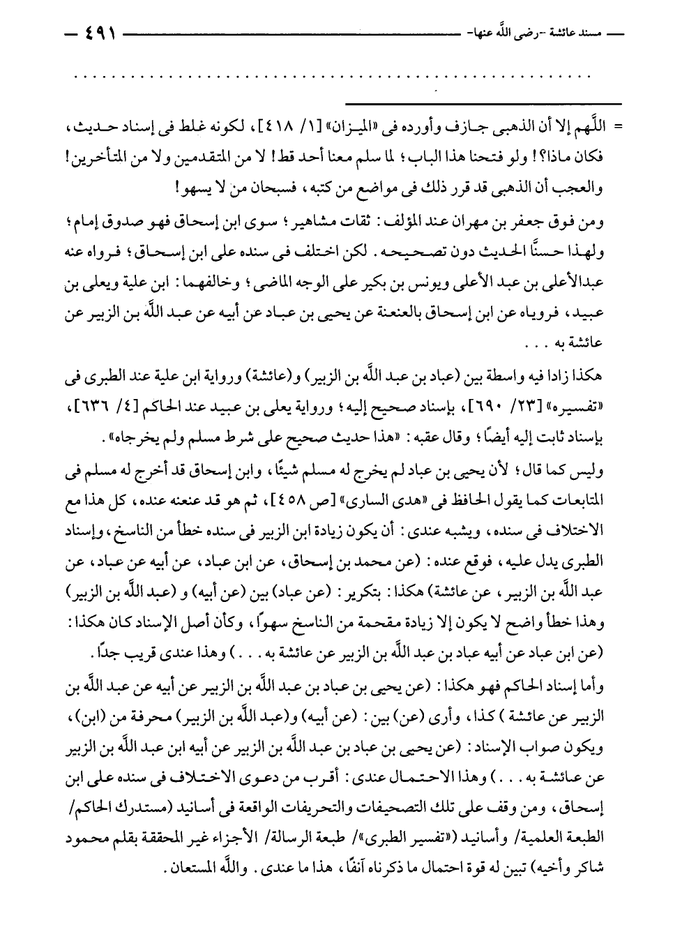 وليس كما قال؛ لأن يحيى بن عباد لم يخرج له مسلم شيئًا، وابن إسحاق قد أخرج له مسلم في المتابعات كما يقول الحافظ في "هدى السارى" [ص ٤٥٨]، ثم هو قد عنعنه عنده، كل هذا مع الاختلاف في سنده، ويشبه عندى: أن يكون زيادة ابن الزبير في سنده خطأ من الناسخ، وإسناد الطبرى يدل عليه، فوقع عنده: (عن محمد بن إسحاق، عن ابن عباد، عن أبيه عن عباد، عن عبد الله بن الزبير، عن عائشة) هكذا: بتكرير: (عن عباد) بين (عن أبيه) و (عبد الله بن الزبير) وهذا خطأ واضح لا يكون إلا زيادة مقحمة من الناسخ سهوًا، وكأن أصل الإسناد كان هكذا: (عن ابن عباد عن أبيه عباد بن عبد الله بن الزبير عن عائشة به ... ) وهذا عندى قريب جدًّا.