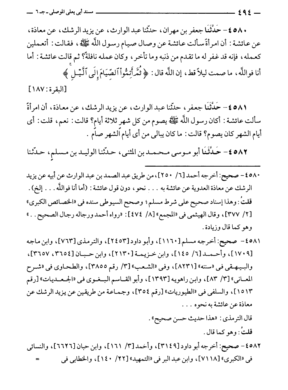 ٤٥٨١ - صحيح: أخرجه مسلم [١١٦٠]، وأبو داود [٢٤٥٣]، والترمذى [٧٦٣]، وابن ماجه [١٧٠٩]، وأحمد [٦/ ١٤٥]، وابن خزيمة [٢١٣٠]، وابن حبان [٣٦٥٤، ٣٦٥٧]، والبيهقى في "سننه" [٨٢٣١]، وفى "الشعب" [٣/ رقم ٣٨٥٥]، والطحاوى في "شرح المعانى" [٣/ ٨٣]، وابن راهويه [١٣٩٣]، وأبو القاسم البغوى في "الجعديات" [رقم ١٥١٣]، والسلفى في "الطيوريات" [رقم ٣٥٤]، وجماعة من طريقين عن يزيد الرشك عن معاذة عن عائشة به نحوه ...
