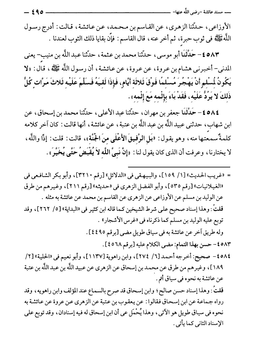 ٤٥٨٣ - حَدَّثَنَا أبو موسى، حَدَّثَنَا محمد بن عثمة، حَدَّثَنَا عبد الله بن منيبٍ - يعنى المدنى - أخبرنى هشام بن عروة، عن عروة، عن عائشة، أن رسول الله - صلى الله عليه وسلم -، قال: "لا يَكُونُ لِمُسْلِمٍ أَنْ يَهْجُرَ مُسْلِمًا فَوْقَ ثَلاثَةِ أَيَّامٍ، فَإِذَا لَقِيَهُ فَسَلَّمَ عَلَيْهِ ثَلاثَ مَرَّاتٍ كُلُّ ذَلِكَ لا يَرُدُّ عَلَيْهِ، فَقَدْ بَاءَ بِإِثْمِهِ مَعَ إثْمِهِ".