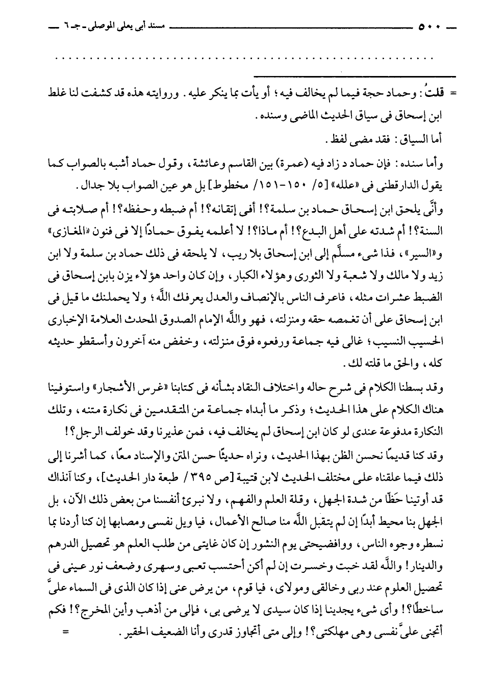 = قلتُ: وحماد حجة فيما لم يخالف فيه؛ أو يأت بما ينكر عليه. وروايته هذه قد كشفت لنا غلط ابن إسحاق في سياق الحديث الماضى وسنده.