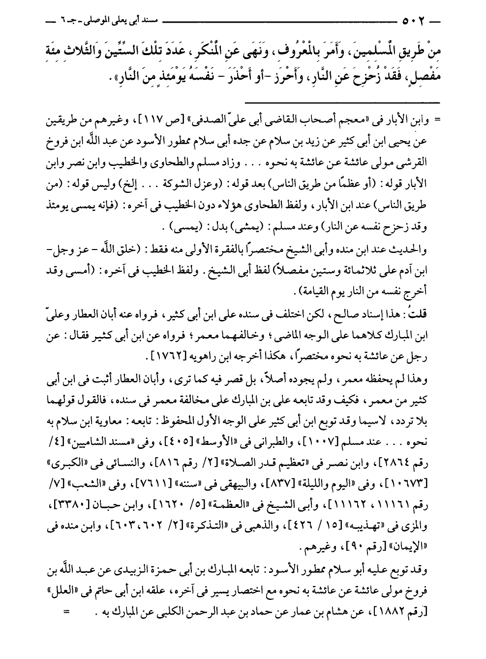 = وابن الأبار في "معجم أصحاب القاضى أبى عليّ الصدفى" [ص ١١٧]، وغيرهم من طريقين عن يحيى بن أبى كثير عن زيد بن سلام عن جده أبى سلام ممطور الأسود عن عبد الله بن فروخ القرشى مولى عائشة عن عائشة به نحوه ... وزاد مسلم والطحاوى والخطيب وابن نصر وابن الأبار قوله: (أو عظمًا من طريق الناس) بعد قوله: (وعزل الشوكة ... إلخ) وليس قوله: (من طريق الناس) عند ابن الأبار، ولفظ الطحاوى هؤلاء دون الخطيب في آخره: (فإنه يمسى يومئذ وقد زحزح نفسه عن النار) وعند مسلم: (يمشى) بدل: (يمسى).