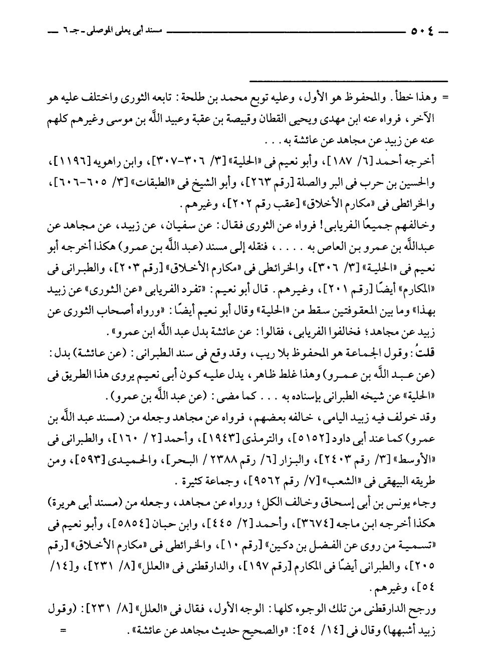 وخالفهم جميعًا الفريابى! فرواه عن الثورى فقال: عن سفيان، عن زبيد، عن مجاهد عن عبد الله بن عمرو بن العاص به .... ، فنقله إلى مسند (عبد الله بن عمرو) هكذا أخرجه أبو نعيم في "الحلية" [٣/ ٣٠٦]، والخرائطى في "مكارم الأخلاق" [رقم ٢٠٣]، والطبرانى في "المكارم" أيضًا [رقم ٢٠١]، وغيرهم. قال أبو نعيم: "تفرد الفريابى "عن الثورى" عن زبيد بهذا" وما بين المعقوفتين سقط من "الحلية" وقال أبو نعيم أيضًا: "ورواه أصحاب الثورى عن زبيد عن مجاهد، فخالفوا الفريابى، فقالوا: عن عائشة بدل عبد الله بن عمرو".