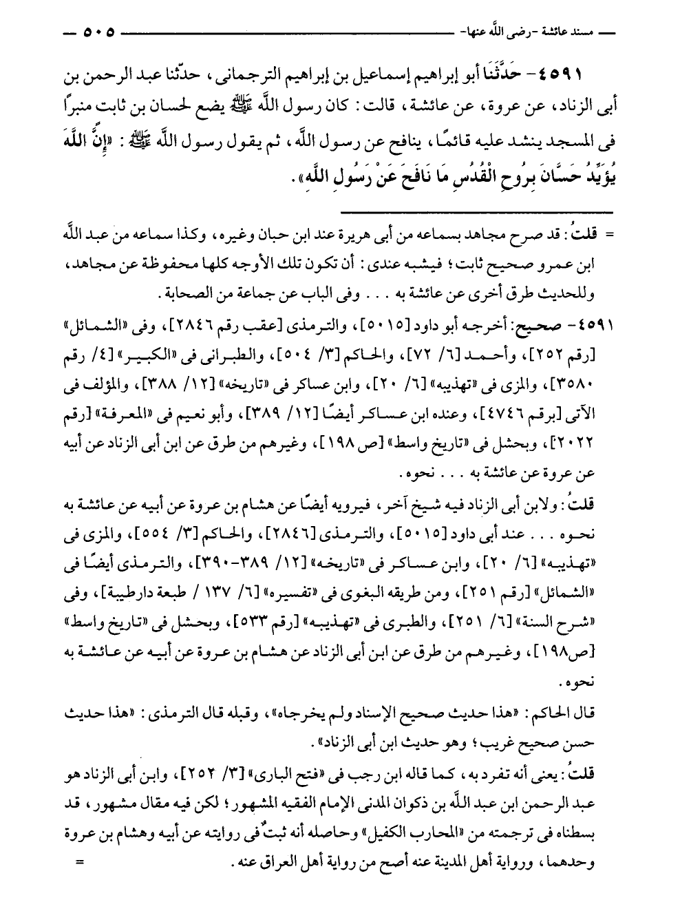 ٤٥٩١ - حَدَّثَنَا أبو إبراهيم إسماعيل بن إبراهيم الترجمانى، حَدَّثَنَا عبد الرحمن بن أبى الزناد، عن عروة، عن عائشة، قالت: كان رسول الله - صلى الله عليه وسلم - يضع لحسان بن ثابت منبرًا في المسجد ينشد عليه قائمًا، ينافح عن رسول الله، ثم يقول رسول الله - صلى الله عليه وسلم -: "إِنَّ اللَّهَ يُؤَيِّدُ حَسَّانَ بِرُوحِ الْقُدُسِ مَا نَافَحَ عَنْ رَسُولِ اللَّهِ".