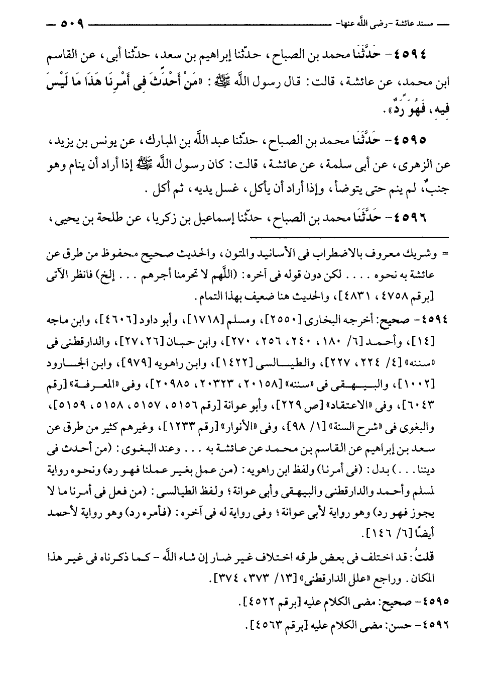 ٤٥٩٤ - حَدَّثَنَا محمد بن الصباح، حَدَّثَنَا إبراهيم بن سعدٍ، حَدَّثَنَا أبى، عن القاسم بن محمدٍ، عن عائشة، قالت: قال رسول الله - صلى الله عليه وسلم -: "مَنْ أَحْدَثَ فِي أَمْرِنَا هَذَا مَا لَيْسَ فِيهِ، فَهُوَ رَدٌ".