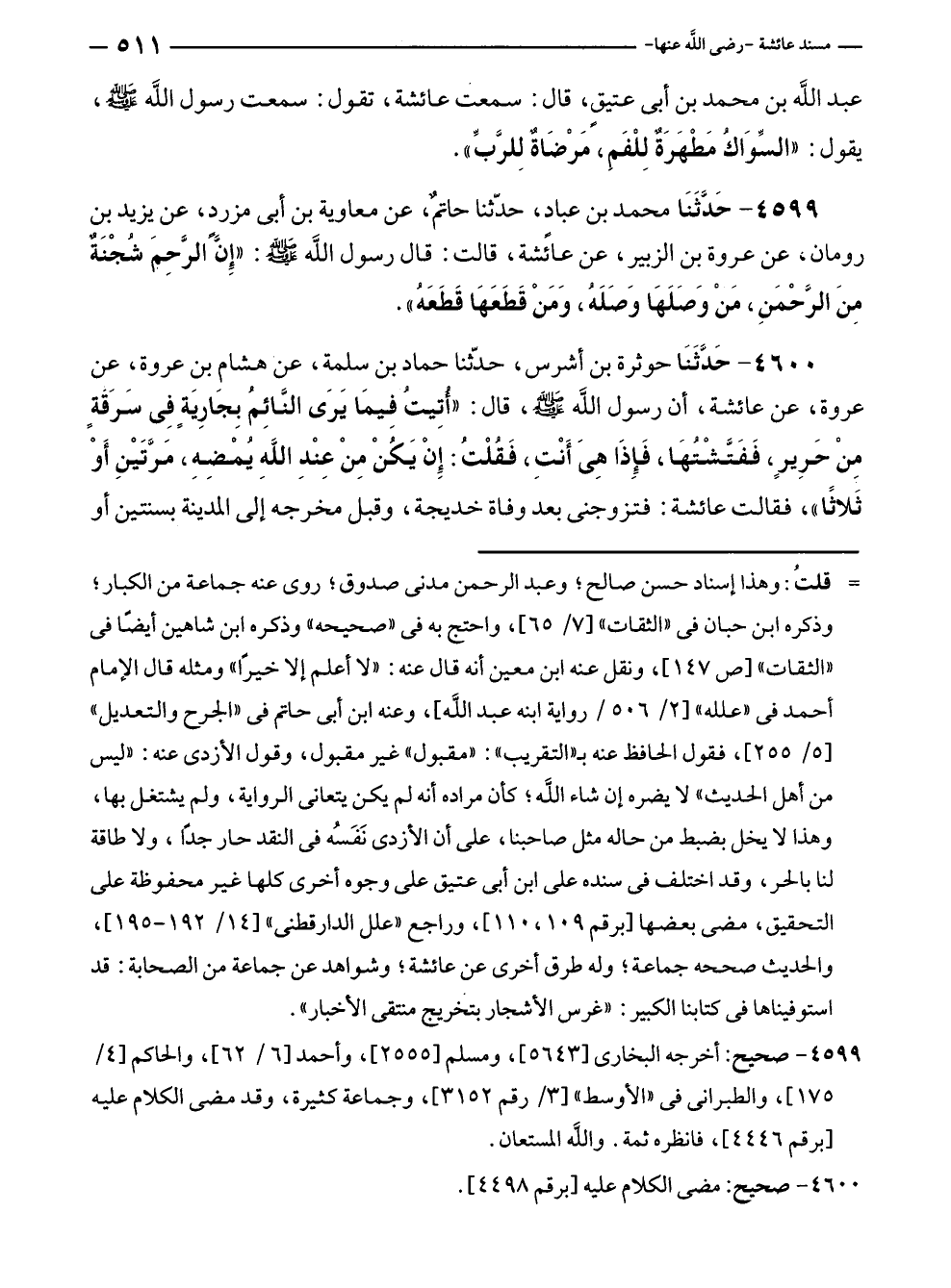 = قلتُ: وهذا إسناد حسن صالح؛ وعبد الرحمن مدنى صدوق؛ روى عنه جماعة من الكبار؛ وذكره ابن حبان في "الثقات" [٧/ ٦٥]، واحتج به في "صحيحه" وذكره ابن شاهين أيضًا في "الثقات" [ص ١٤٧]، ونقل عنه ابن معين أنه قال عنه: "لا أعلم إلا خيرًا" ومثله قال الإمام أحمد في "علله" [٢/ ٥٠٦/ رواية ابنه عبد الله]، وعنه ابن أبى حاتم في "الجرح والتعديل" [٥/ ٢٥٥]، فقول الحافظ عنه بـ"التقريب": "مقبول" غير مقبول، وقول الأزدى عنه: "ليس من أهل الحديث" لا يضره إن شاء الله؛ كأن مراده أنه لم يكن يتعانى الرواية، ولم يشتغل بها، وهذا لا يخل بضبط من حاله مثل صاحبنا، على أن الأزدى نَفَسُه في النقد حار جدًّا، ولا طاقة لنا بالحر، وقد اختلف في سنده على ابن أبى عتيق على وجوه أخرى كلها غير محفوظة على التحقيق، مضى بعضها [برقم ١٠٩، ١١٠]، وراجع "علل الدارقطنى" [١٤/ ١٩٢ - ١٩٥]، والحديث صححه جماعة؛ وله طرق أخرى عن عائشة؛ وشواهد عن جماعة من الصحابة: قد استوفيناها في كتابنا الكبير: "غرس الأشجار بتخريج منتقى الأخبار".