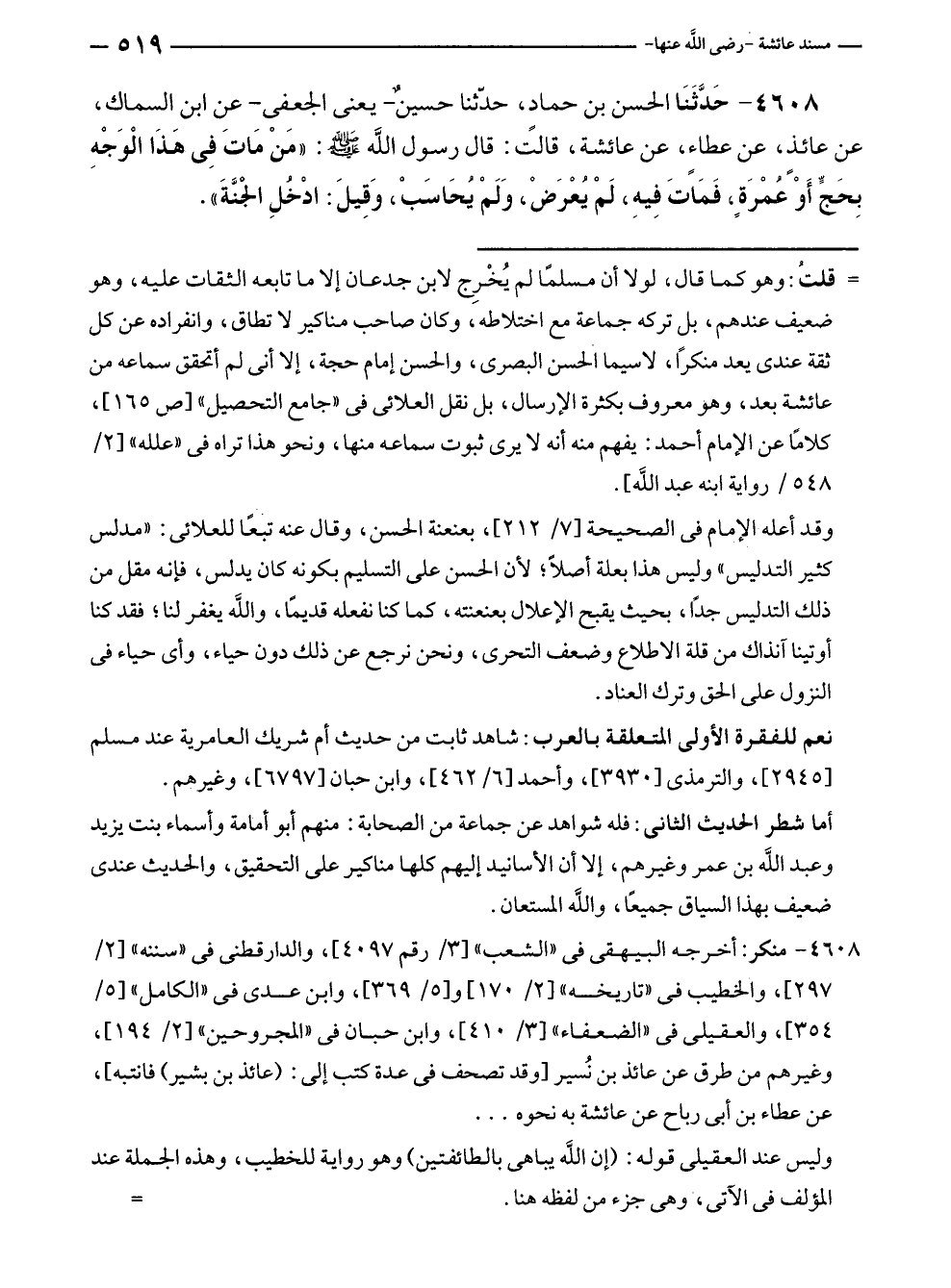 ٤٦٠٨ - حَدَّثَنَا الحسن بن حمادٍ، حَدَّثَنَا حسينٌ - يعنى الجعفى - عن ابن السماك، عن عائذ، عن عطاء، عن عائشة، قالت: قال رسول الله - صلى الله عليه وسلم -: "مَنْ مَاتَ فِي هَذَا الْوَجْهِ بِحَجٍّ أَوْ عُمْرَةٍ، فَمَاتَ فِيهِ، لَمْ يُعْرَضْ، وَلَمْ يُحَاسَبْ، وَقِيلَ: ادْخلِ الجَنَّةَ".