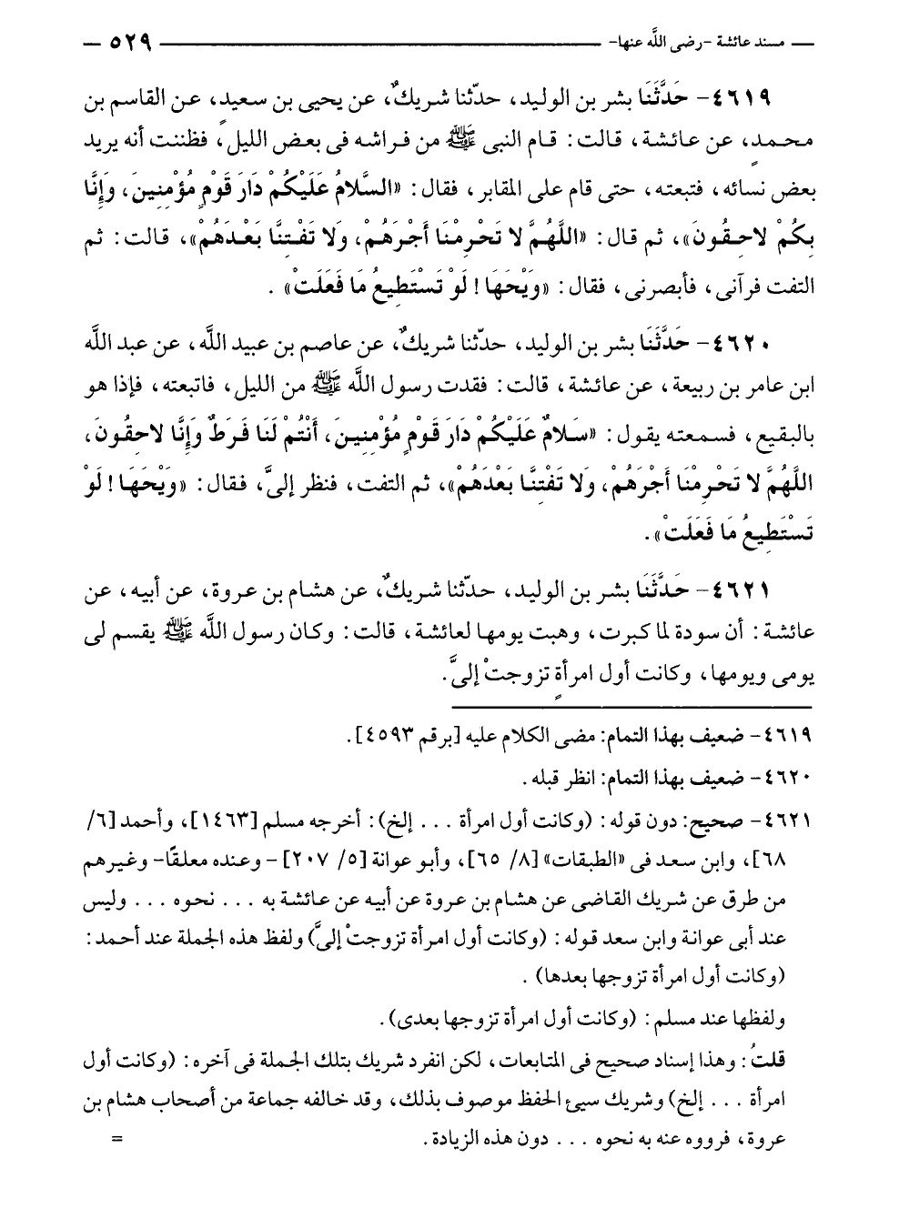 ٤٦٢٠ - حَدَّثَنَا بشر بن الوليد، حَدَّثَنَا شريكٌ، عن عاصم بن عبيد الله، عن عبد الله بن عامر بن ربيعة، عن عائشة، قالت: فقدت رسول الله - صلى الله عليه وسلم - من الليل، فاتبعته، فإذا هو بالبقيع، فسمعته يقول: "سَلامٌ عَلَيْكُمْ دَارَ قَوْمٍ مُؤْمِنِينَ، أَنْتُمْ لَنَا فَرَطٌ وَإِنَّا لاحِقُونَ، اللَّهُمَّ لا تَحْرِمْنَا أَجْرَهُمْ، وَلا تَفْتِنَّا بَعْدَهُمْ"، ثم التفت، فنظر إليَّ، ققال: "وَيْحَهَا! لَوْ تَسْتَطِيعُ مَا فَعَلَتْ".
