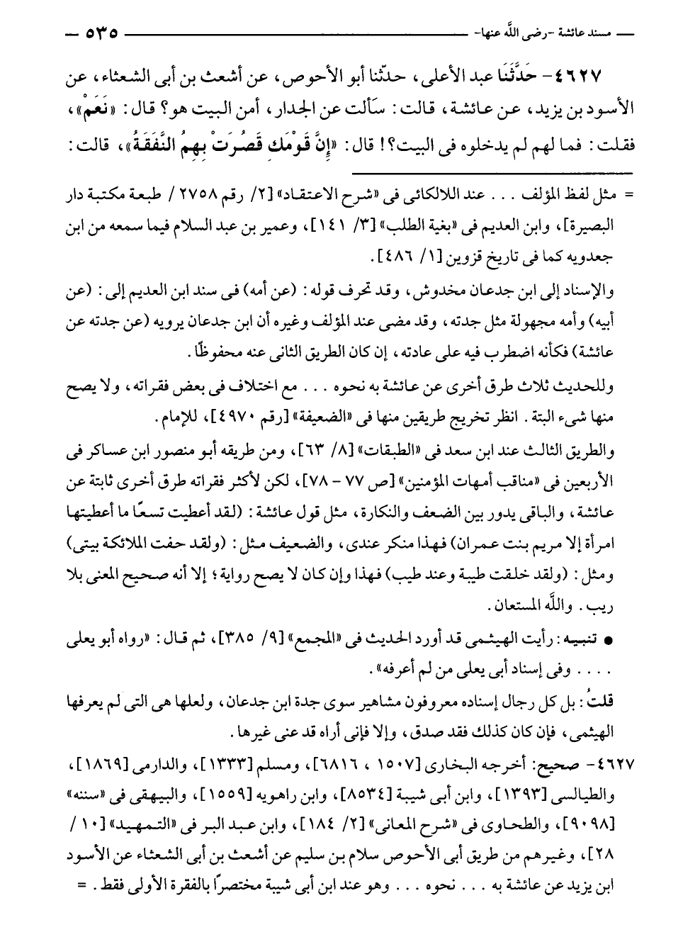 ٤٦٢٧ - حَدَّثَنَا عبد الأعلى، حَدَّثَنَا أبو الأحوص، عن أشعث بن أبى الشعثاء، عن الأسود بن يزيد، عن عائشة، قالت: سَألت عن الجدار، أمن البيت هو؟ قال: "نَعَمْ"، فقلت: فما لهم لم يدخلوه في البيت؟! قال: "إِنَّ قَوْمَكِ قَصُرَتْ بِهِمُ النَّفَقَةُ"، قالت: