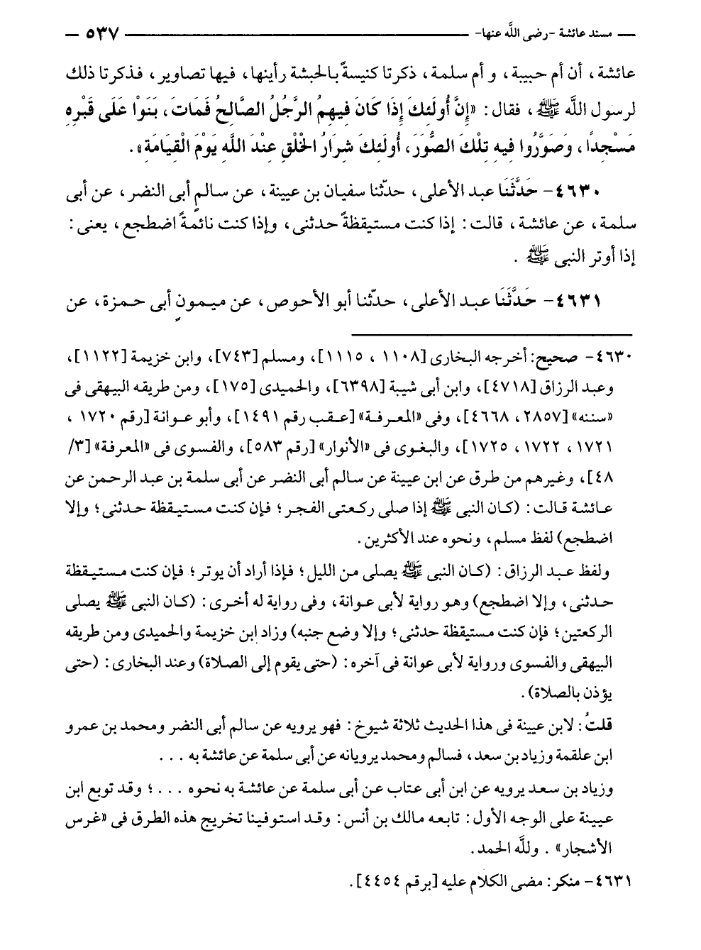 ٤٦٣٠ - صحيح: أخرجه البخارى [١١٠٨، ١١١٥]، ومسلم [٧٤٣]، وابن خزيمة [١١٢٢]، وعبد الرزاق [٤٧١٨]، وابن أبى شيبة [٦٣٩٨]، والحميدى [١٧٥]، ومن طريقه البيهقى في "سننه" [٢٨٥٧، ٤٦٦٨]، وفى "المعرفة" [عقب رقم ١٤٩١]، وأبو عوانة [رقم ١٧٢٠، ١٧٢١، ١٧٢٢، ١٧٢٥]، والبغوى في "الأنوار" [رقم ٥٨٣]، والفسوى في "المعرفة" [٣/ ٤٨]، وغيرهم من طرق عن ابن عيينة عن سالم أبى النضر عن أبى سلمة بن عبد الرحمن عن عائشة قالت: (كان النبي - صلى الله عليه وسلم - إذا صلى ركعتى الفجر؛ فإن كنت مستيقظة حدثنى؛ وإلا اضطجع) لفظ مسلم، ونحوه عند الأكثرين.