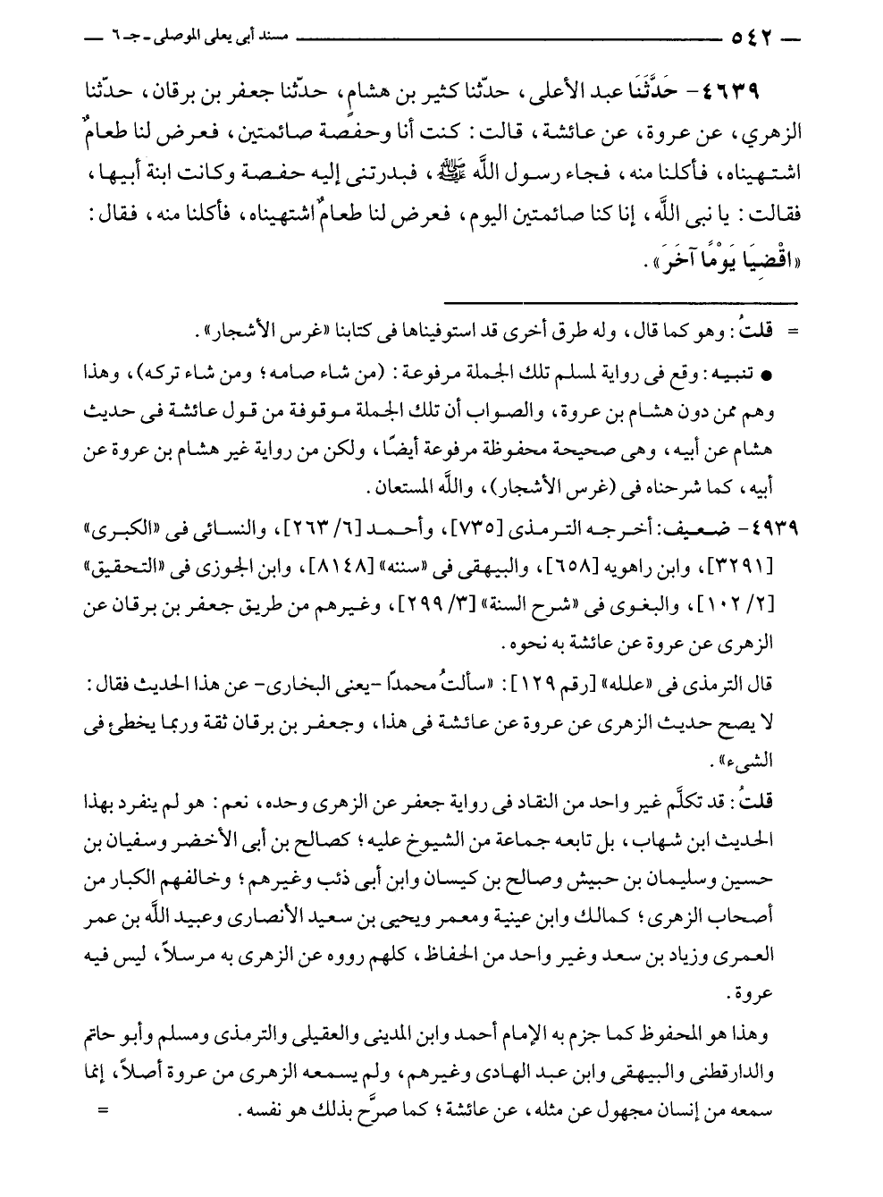 قلتُ: قد تكلَّم غير واحد من النقاد في رواية جعفر عن الزهرى وحده، نعم: هو لم ينفرد بهذا الحديث ابن شهاب، بل تابعه جماعة من الشيوخ عليه؛ كصالح بن أبى الأخضر وسفيان بن حسين وسليمان بن حبيش وصالح بن كيسان وابن أبى ذئب وغيرهم؛ وخالفهم الكبار من أصحاب الزهرى؛ كمالك وابن عينية ومعمر ويحيى بن سعيد الأنصارى وعبيد الله بن عمر العمرى وزياد بن سعد وغير واحد من الحفاظ، كلهم رووه عن الزهرى به مرسلًا، ليس فيه عروة.