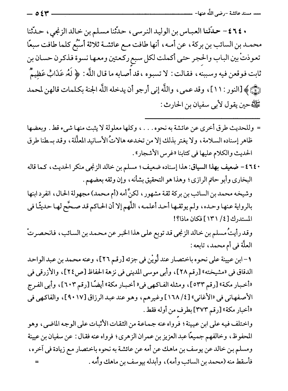 واختلف فيه على ابن عيينة؛ فرواه عنه جماعة من الثقات الأثبات على الوجه الماضى، وهو المحفوظ، وخالفهم جميعًا عبد العزيز بن عمران الزهرى؛ فرواه عنه فقال: عن سفيان بن عيينة ومسلم بن خالد عن يوسف بن ماهك عن أمه عن عائشة به نحوه باختصار مع زيادة في آخره، فأسقط منه (محمد بن السائب وأمه)، وأبدله بيوسف بن ماهك وأُمه. =