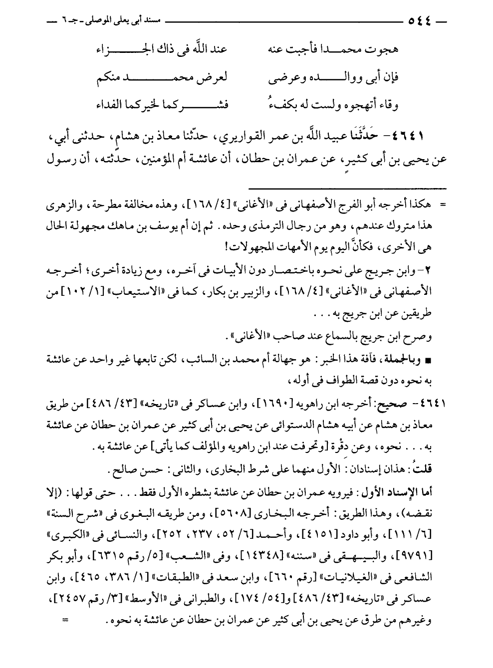 ٤٦٤١ - حَدَّثَنَا عبيد الله بن عمر القواريري، حَدَّثَنَا معاذ بن هشامٍ، حدثنى أبي، عن يحيى بن أبى كثيرٍ، عن عمران بن حطان، أن عائشة أم المؤمنين، حدثته، أن رسول