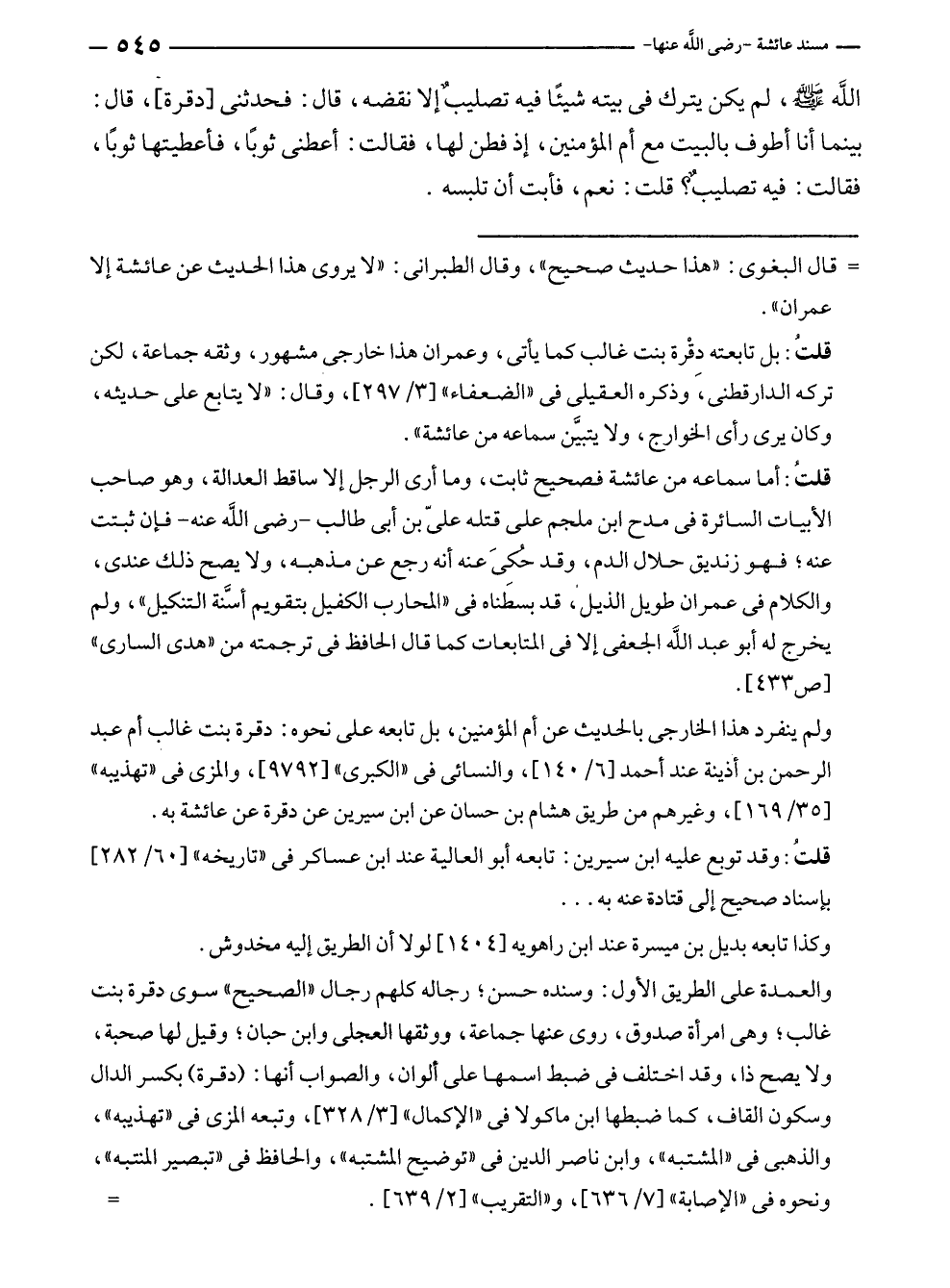 قلتُ: بل تابعته دِقْرة بنت غالب كما يأتى، وعمران هذا خارجى مشهور، وثقه جماعة، لكن تركه الدارقطنى، وذكره العقيلى في "الضعفاء" [٣١/ ٢٩٧]، وقال: "لا يتابع على حديثه، وكان يرى رأى الخوارج، ولا يتبيَّن سماعه من عائشة".