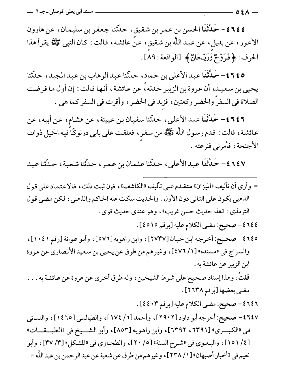 ٤٦٤٤ - حَدَّثَنَا الحسن بن عمر بن شقيق، حَدَّثَنَا جعفر بن سليمان، عن هارون الأعور، عن بديلٍ، عن عبد الله بن شقيقٍ، عن عائشة، قالت: كان النبي - صلى الله عليه وسلم - يقرأ هذا الحرف: روح {فَرَوْحٌ وَرَيْحَانٌ} [الواقعة: ٨٩].