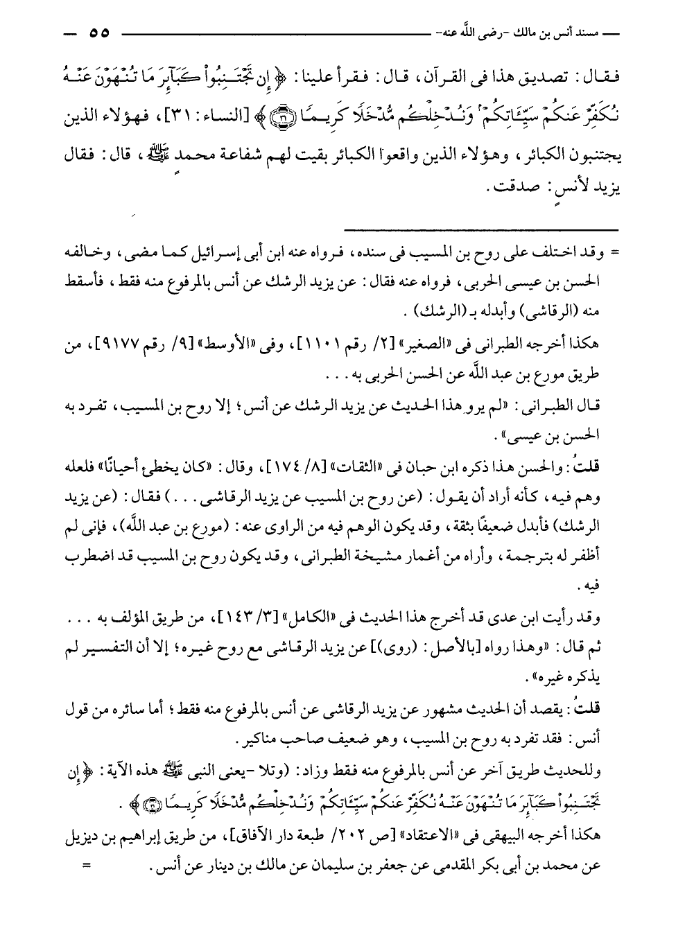 فقال: تصديق هذا في القرآن، قال: فقرأ علينا: {إِنْ تَجْتَنِبُوا كَبَائِرَ مَا تُنْهَوْنَ عَنْهُ نُكَفِّرْ عَنْكُمْ سَيِّئَاتِكُمْ وَنُدْخِلْكُمْ مُدْخَلًا كَرِيمًا (٣١)} [النساء: ٣١]، فهؤلاء الذين يجتنبون الكبائر، وهؤلاء الذين واقعوا الكبائر بقيت لهم شفاعة محمدٍ - صلى الله عليه وسلم -، قال: فقال يزيد لأنسٍ: صدقت.