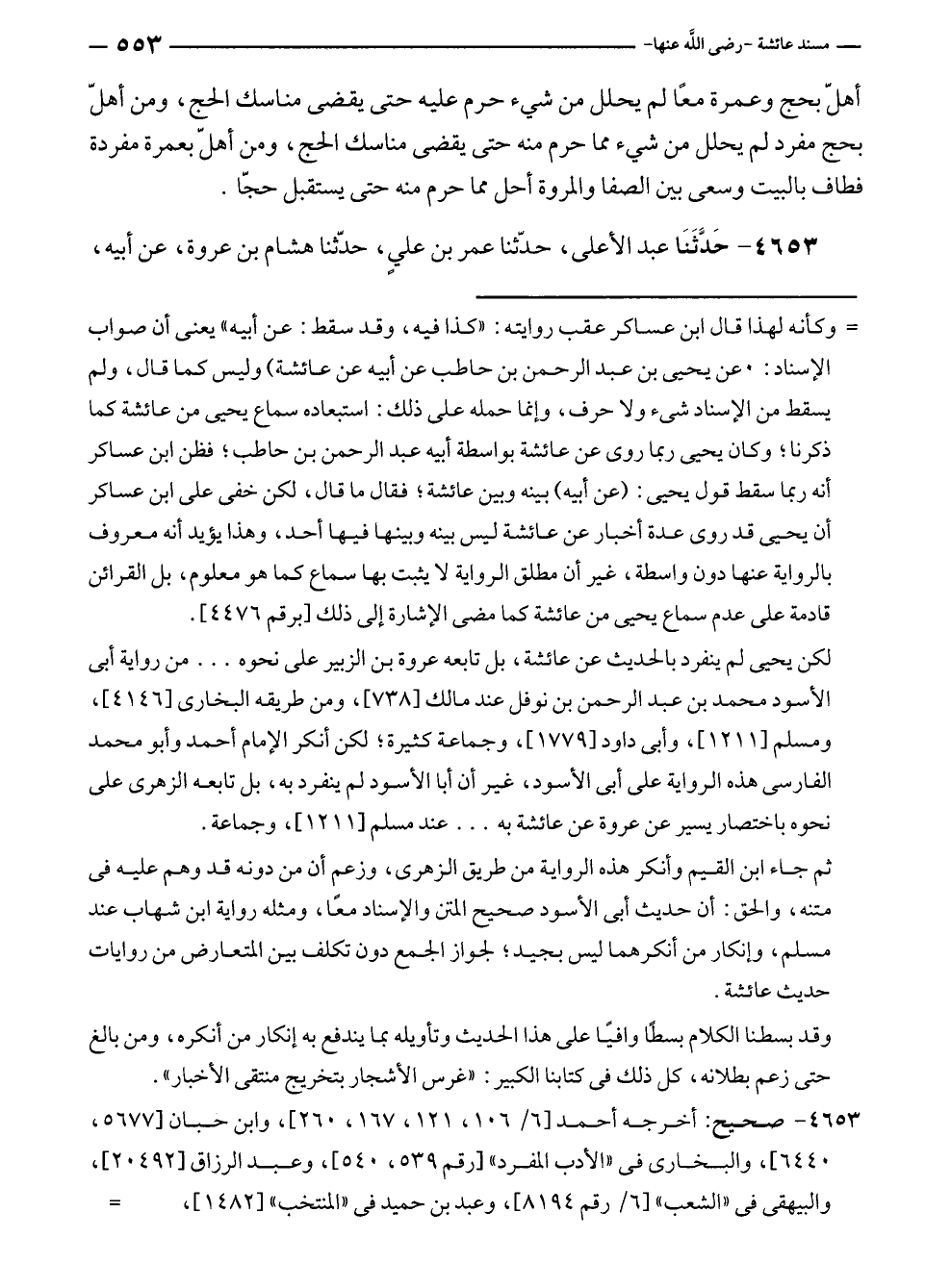 = وكأنه لهذا قال ابن عساكر عقب روايته: "كذا فيه، وقد سقط: عن أبيه" يعنى أن صواب الإسناد: عن يحيى بن عبد الرحمن بن حاطب عن أبيه عن عائشة) وليس كما قال، ولم يسقط من الإسناد شئ ولا حرف، وإنما حمله على ذلك: استبعاده سماع يحيى من عائشة كما ذكرنا؛ وكان يحيى ربما روى عن عائشة بواسطة أبيه عبد الرحمن بن حاطب؛ فظن ابن عساكر أنه ربما سقط قول يحيى: (عن أبيه) بينه وبين عائشة؛ فقال ما قال، لكن خفى على ابن عساكر أن يحيى قد روى عدة أخبار عن عائشة ليس بينه وبينها فيها أحد، وهذا يؤيد أنه معروف بالرواية عنها دون واسطة، غير أن مطلق الرواية لا يثبت بها سماع كما هو معلوم، بل القرائن قادمة على عدم سماع يحيى من عائشة كما مضى الإشارة إلى ذلك [برقم ٤٤٧٦].