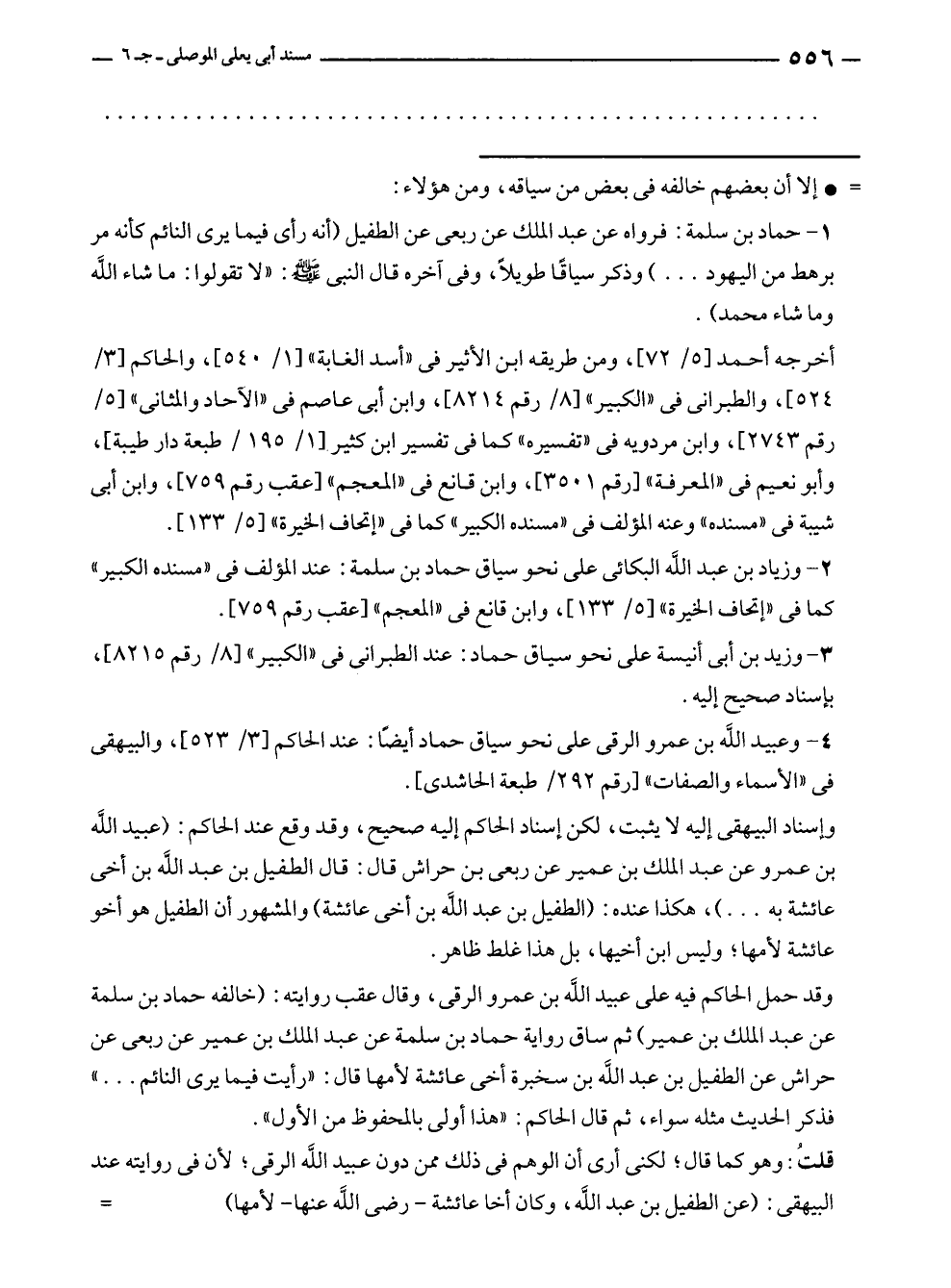 ١ - حماد بن سلمة: فرواه عن عبد الملك عن ربعى عن الطفيل (أنه رأى فيما يرى النائم كأنه مر برهط من اليهود ... ) وذكر سياقًا طويلًا، وفى آخره قال النبي - صلى الله عليه وسلم -: "لا تقولوا: ما شاء الله وما شاء محمد).
