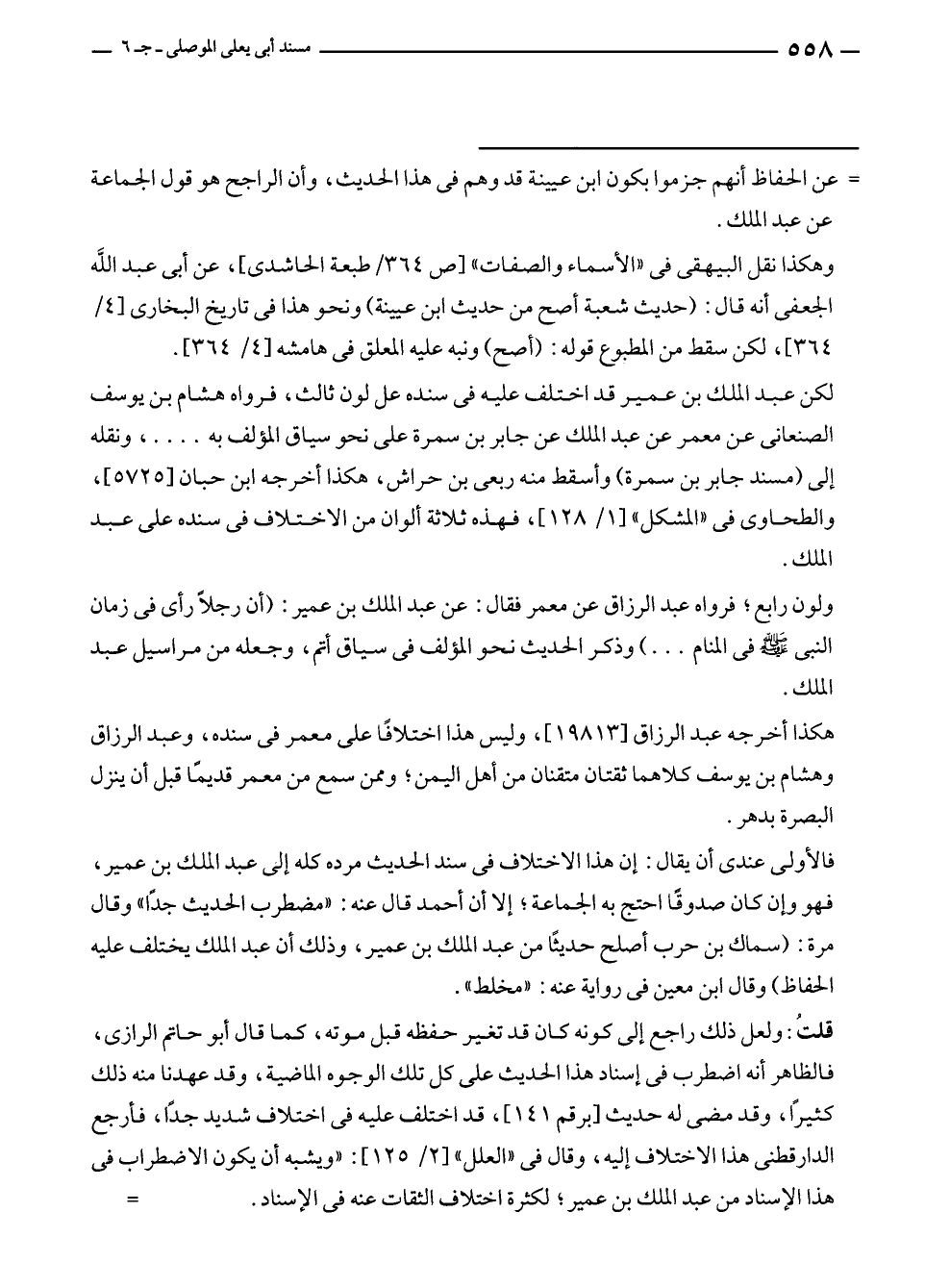لكن عبد الملك بن عمير قد اختلف عليه في سنده عل لون ثالث، فرواه هشام بن يوسف الصنعانى عن معمر عن عبد الملك عن جابر بن سمرة على نحو سياق المؤلف به .... ، ونقله إلى (مسند جابر بن سمرة) وأسقط منه ربعى بن حراش، هكذا أخرجه ابن حبان [٥٧٢٥]، والطحاوى في "المشكل" [١/ ١٢٨]، فهذه ثلاثة ألوان من الاختلاف في سنده على عبد الملك.