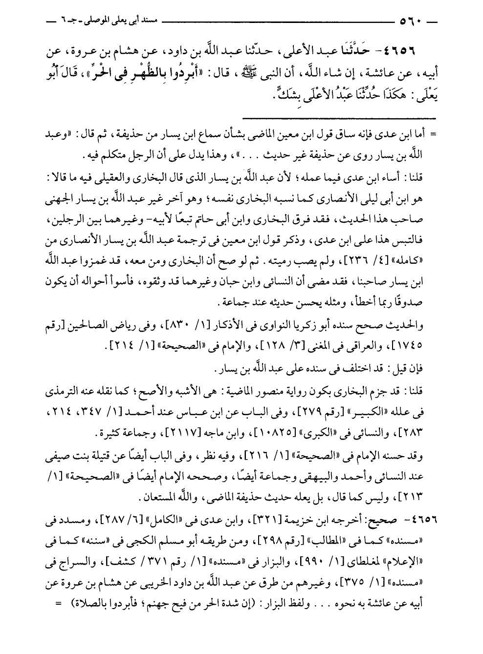 ٤٦٥٦ - حَدَّثَنَا عبد الأعلى، حَدَّثَنَا عبد الله بن داود، عن هشام بن عروة، عن أبيه، عن عائشة، إن شاء الله، أن النبي - صلى الله عليه وسلم -، قال: "أَبْرِدُوا بِالظُّهْرِ فِي الحرِّ"، قَالَ أبُو يَعْلَى: هَكَذَا حُدِّثْنَا عَبْدُ الأعْلَى بِشَكٍّ.