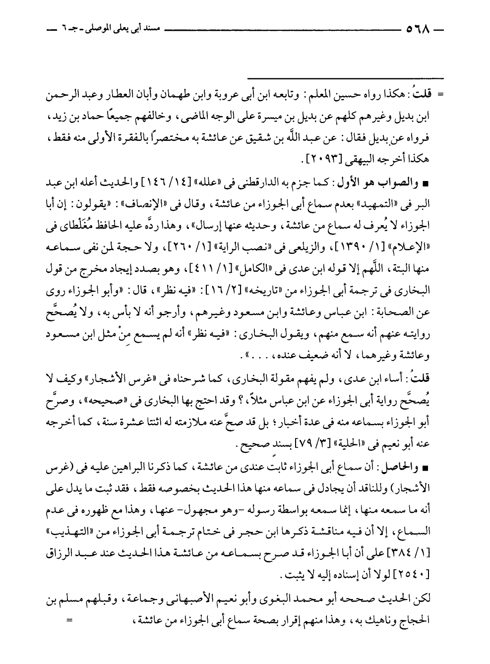• والحاصل: أن سماع أبى الجوزاء ثابت عندى من عائشة، كما ذكرنا البراهين عليه في (غرس الأشجار) وللناقد أن يجادل في سماعه منها هذا الحديث بخصوصه فقط، فقد ثبت ما يدل على أنه ما سمعه منها، إنما سمعه بواسطة رسوله - وهو مجهول - عنها، وهذا مع ظهوره في عدم السماع، إلا أن فيه مناقشة ذكرها ابن حجر في ختام ترجمة أبى الجوزاء من "التهذيب" [١/ ٣٨٤] على أن أبا الجوزاء قد صرح بسماعه من عائشة هذا الحديث عند عبد الرزاق [٢٥٤٠] لولا أن إسناده إليه لا يثبت.