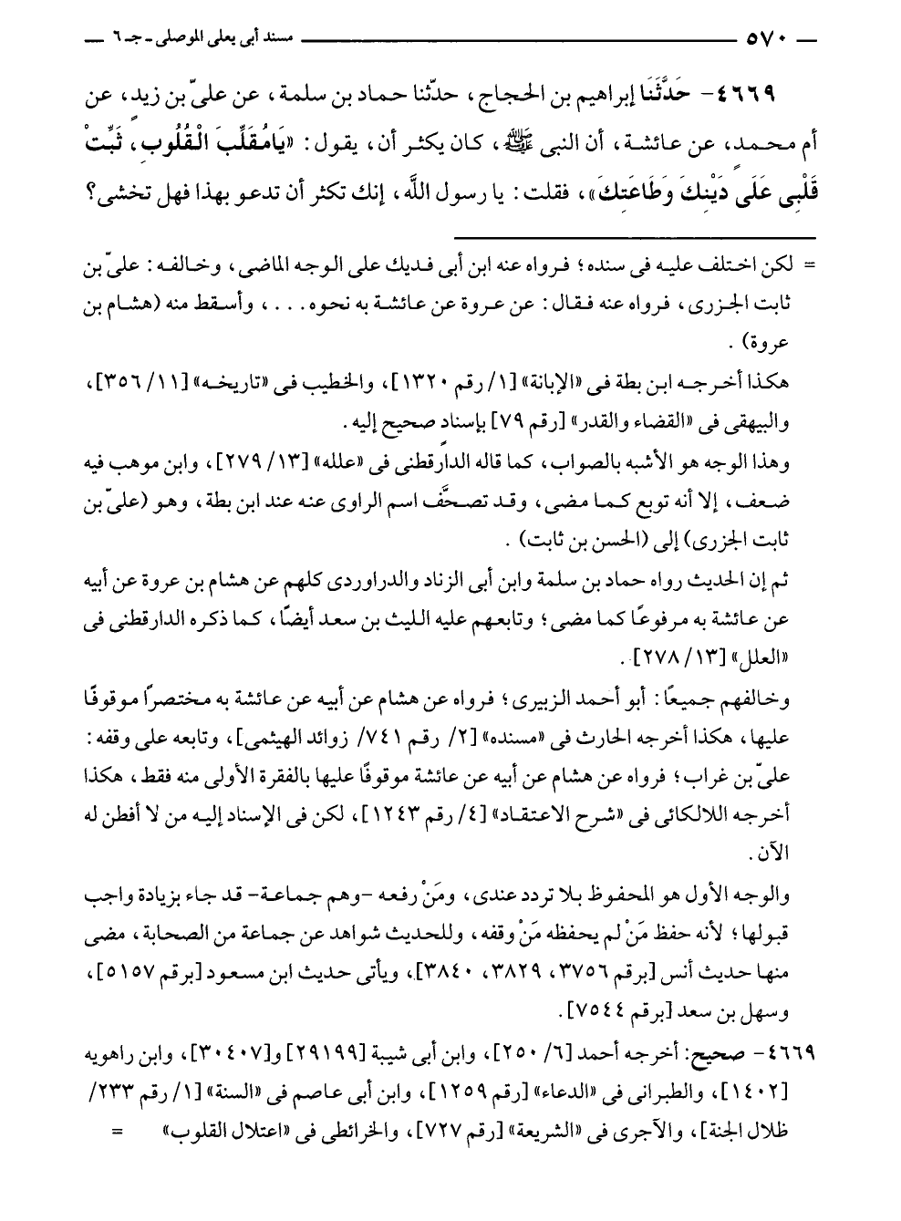 ٤٦٦٩ - حَدَّثَنَا إبراهيم بن الحجاج، حدّثنا حماد بن سلمة، عن عليّ بن زيدٍ، عن أم محمد، عن عائشة، أن النبي - صلى الله عليه وسلم -، كان يكثر أن، يقول: "يَا مُقَلِّبَ الْقُلُوبِ، ثَبِّتْ قَلْبِى عَلَى دَيْنِكَ وَطَاعَتِكَ"، فقلت: يا رسول الله، إنك تكثر أن تدعو بهذا فهل تخشى؟