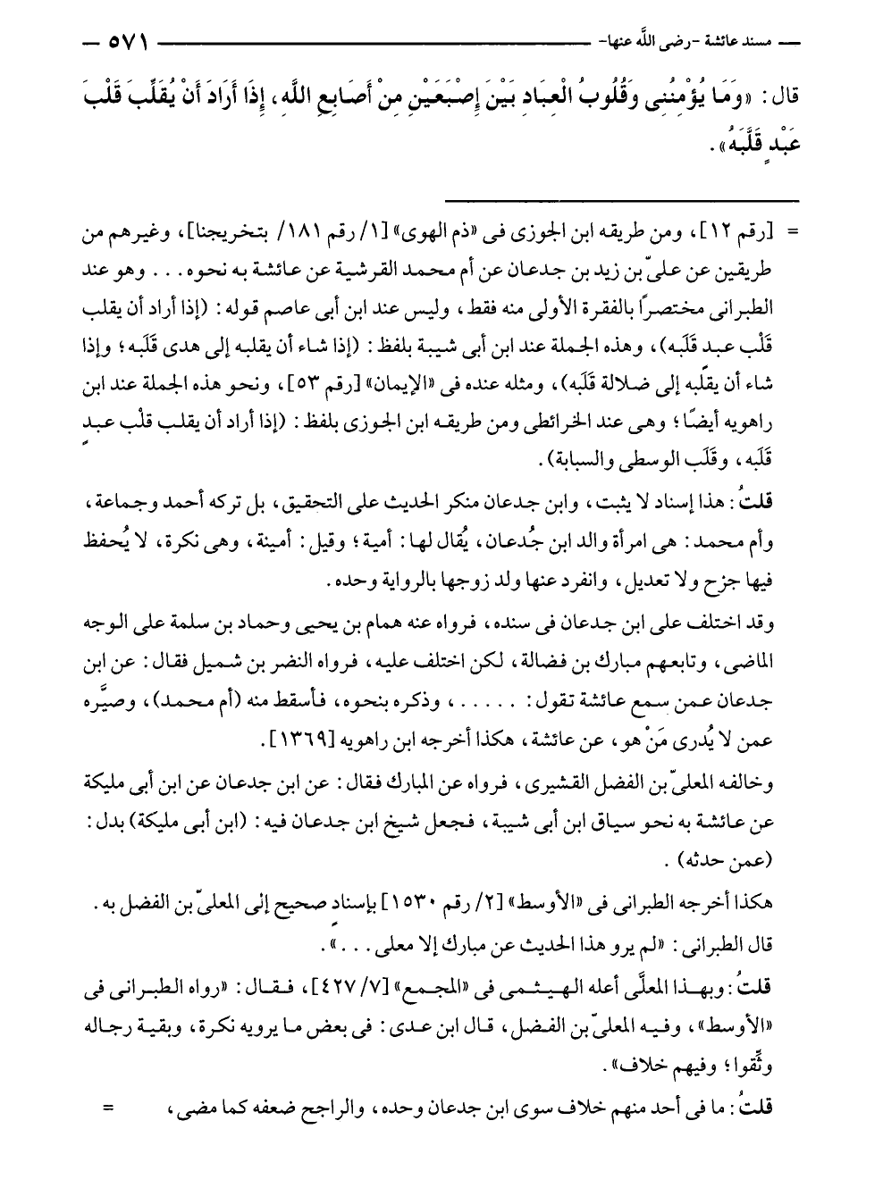 = [رقم ١٢]، ومن طريقه ابن الجوزى في "ذم الهوى" [١/ رقم ١٨١/ بتخريجنا]، وغيرهم من طريقين عن عليّ بن زيد بن جدعان عن أم محمد القرشية عن عائشة به نحوه ... وهو عند الطبرانى مختصرًا بالفقرة الأولى منه فقط، وليس عند ابن أبى عاصم قوله: (إذا أراد أن يقلب قَلْب عبدٍ قَلَبه)، وهذه الجملة عند ابن أبى شيبة بلفظ: (إذا شاء أن يقلبه إلى هدى قَلَبه، وإذا شاء أن يقلبه إلى ضلالة قَلَبه)، ومثله عنده في "الإيمان" [رقم ٥٣]، ونحو هذه الجملة عند ابن راهويه أيضًا؛ وهى عند الخرائطى ومن طريقه ابن الجوزى بلفظ: (إذا أراد أن يقلب قلْب عبدٍ قَلَبه، وقَلَب الوسطى والسبابة).