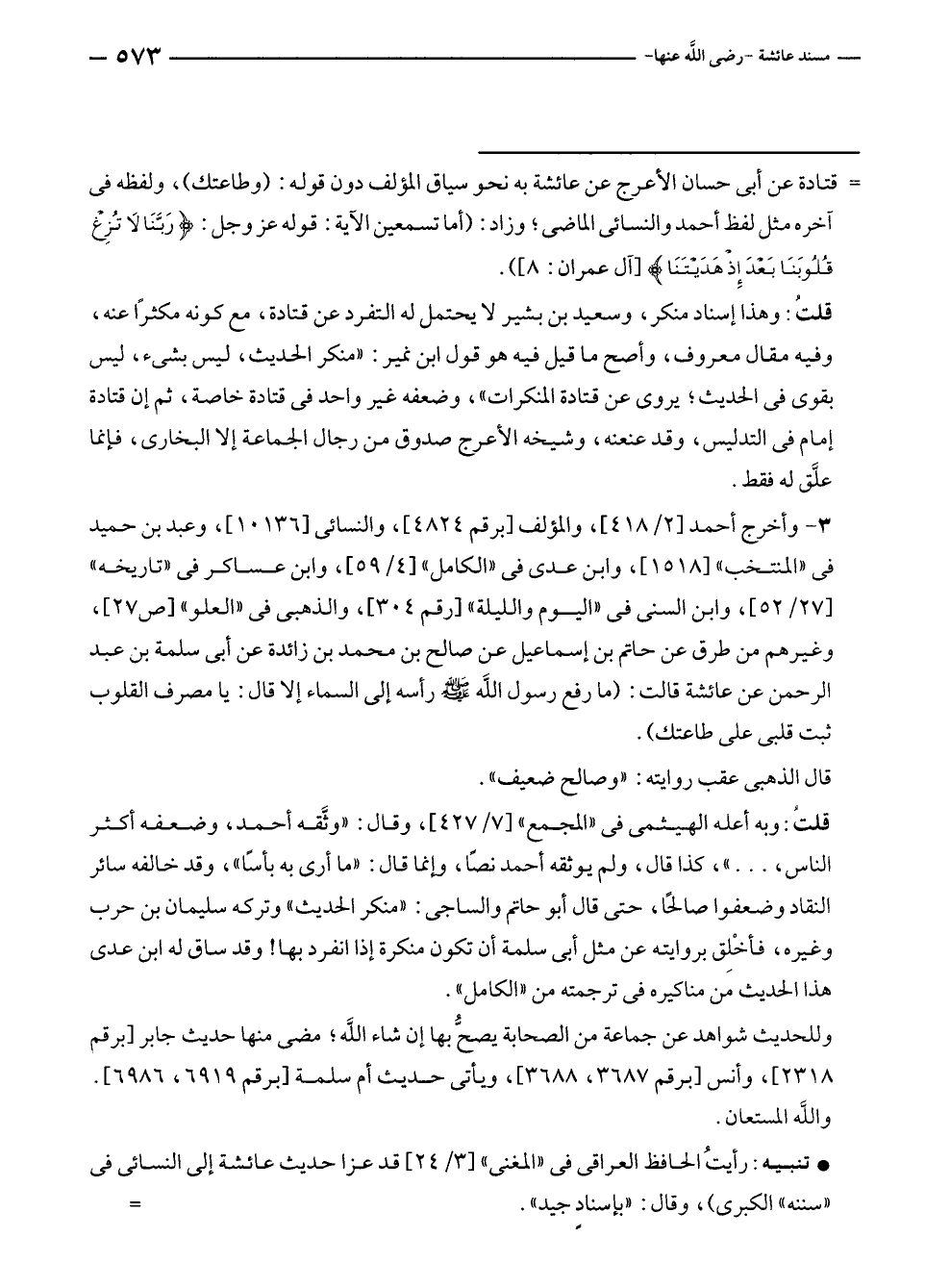 = قتادة عن أبى حسان الأعرج عن عائشة به نحو سياق المؤلف دون قوله: (وطاعتك)، ولفظه في آخره مثل لفظ أحمد والنسائى الماضى؛ وزاد: (أما تسمعين الآية: قوله عز وجل: {رَبَّنَا لَا تُزِغْ قُلُوبَنَا بَعْدَ إِذْ هَدَيْتَنَا} [آل عمران: ٨]).