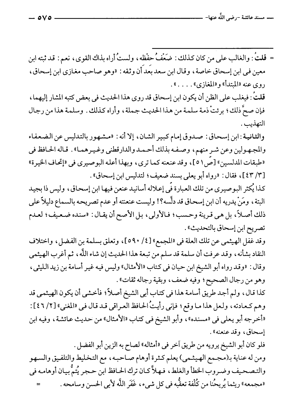 كذا يكثر البوصيرى من تلك العبارة في إعلاله أسانيد عنعن فيها ابن إسحاق، وليس ذا بجيد البتة، ومَنْ يدريه أن ابن إسحاق قد دلَّسه؟! وليست عنعنته أو عدم تصريحه بالسماع دليلًا على ذلك أصلًا، بل هي قرينة وحسب؛ فالأولى، بل الأصح أن يقال: "سنده ضعيف؛ لعدم تصريح ابن إسحاق بالتحديث".