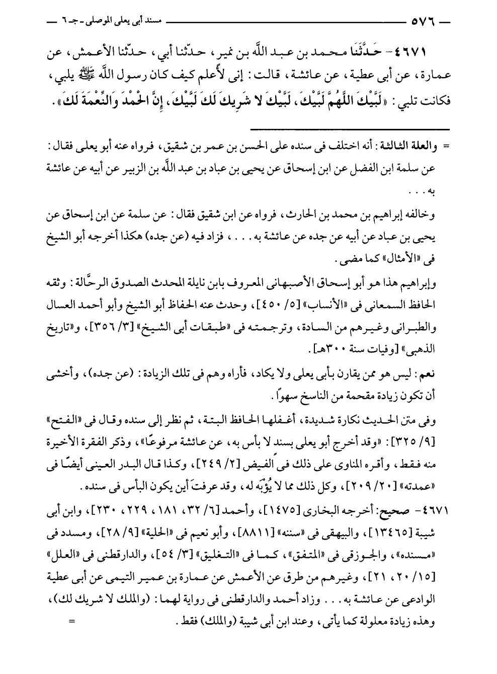 ٤٦٧١ - صحيح: أخرجه البخارى [١٤٧٥]، وأحمد [٦/ ٣٢، ١٨١، ٢٢٩، ٢٣٠]، وابن أبى شيبة [١٣٤٦٥]، والبيهقى في "سننه" [٨٨١١]، وأبو نعيم في "الحلية" [٩/ ٢٨]، ومسدد في "مسنده"، والجوزقى في "المتفق"، كما في "التغليق" [٣/ ٥٤]، والدارقطنى في "العلل" [١٥/ ٢٠، ٢١]، وغيرهم من طرق عن الأعمش عن عمارة بن عمير التيمى عن أبى عطية الوادعى عن عائشة به ... وزاد أحمد والدارقطنى في رواية لهما: (والملك لا شريك لك)، وهذه زيادة معلولة كما يأتى، وعند ابن أبى شيبة (والملك) فقط. =
