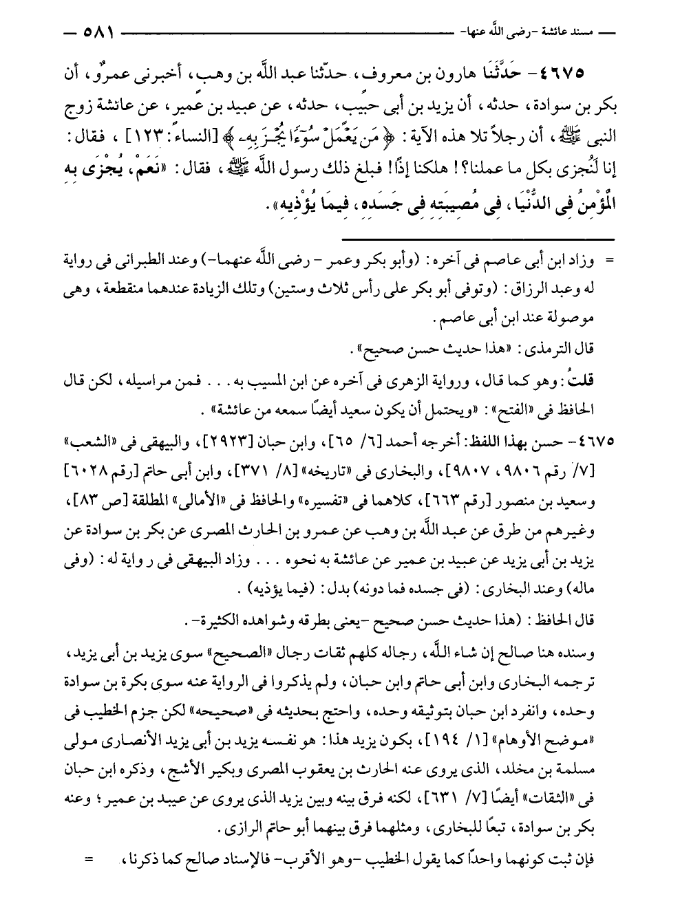 ٤٦٧٥ - حَدَّثَنَا هارون بن معروفٍ، حدّثنا عبد الله بن وهبٍ، أخبرنى عمرٌو، أن بكر بن سوادة، حدثه، أن يزيد بن أبى حبيب، حدثه، عن عبيد بن عمير، عن عائشة زوج النبي - صلى الله عليه وسلم -، أن رجلًا تلا هذه الآية: {مَنْ يَعْمَلْ سُوءًا يُجْزَ بِهِ} [النساء: ١٢٣]، فقال: إنا لَنُجزى بكل ما عملنا؟! هلكنا إذًا! فبلغ ذلك رسول الله - صلى الله عليه وسلم -، فقال: "نَعَمْ، يُجْزَى بِهِ المُؤْمِنُ فِي الدُّنْيَا، فِي مُصِيبَتِهِ فِي جَسَدِهِ، فِيمَا يُؤْذِيهِ".