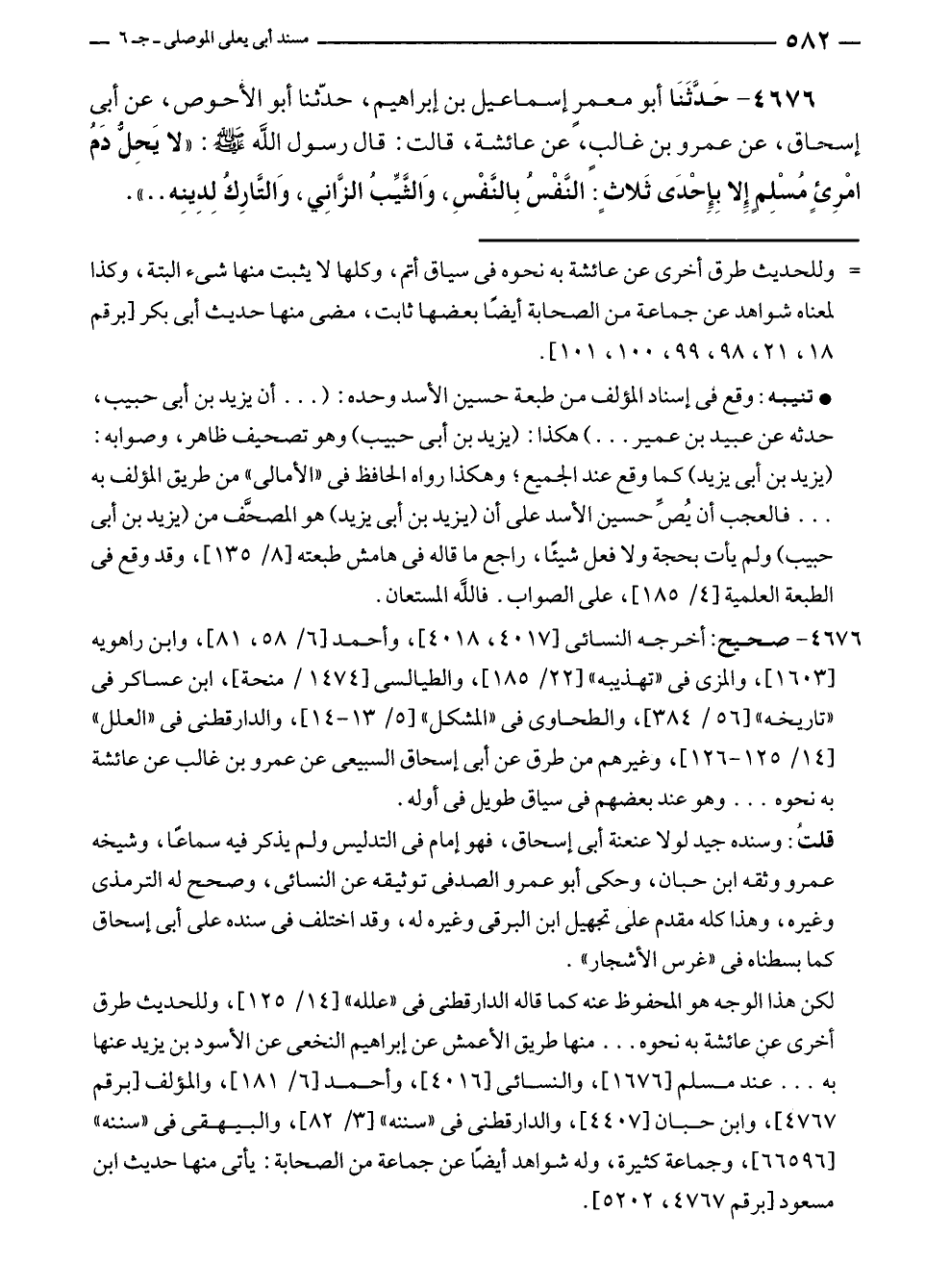 ٤٦٧٦ - حَدَّثَنَا أبو معمر إسماعيل بن إبراهيم، حدّثنا أبو الأحوص، عن أبى إسحاق، عن عمرو بن غالبٍ، عن عائشة، قالت: قال رسول الله - صلى الله عليه وسلم -: "لا يَحِلُّ دَمُ امْرِئٍ مُسْلِمٍ إِلا بِإِحْدَى ثَلاثٍ. النَّفْس بِالنَّفْسِ، وَالثَّيِّبُ الزَّانِي، وَالتَّارِك لِدِينِه .. ".
