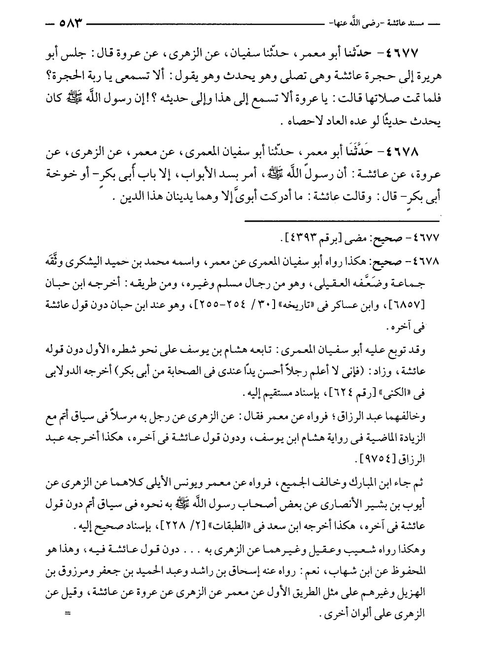 ٤٦٧٧ - حدّثنا أبو معمر، حدّثنا سفيان، عن الزهرى، عن عروة قال: جلس أبو هريرة إلى حجرة عائشة وهى تصلى وهو يحدث وهو يقول: ألا تسمعى يا ربة الحجرة؟ فلما تمت صلاتها قالت: يا عروة ألا تسمع إلى هذا وإلى حديثه؟! إن رسول الله - صلى الله عليه وسلم - كان يحدث حديثًا لو عده العاد لأحصاه.