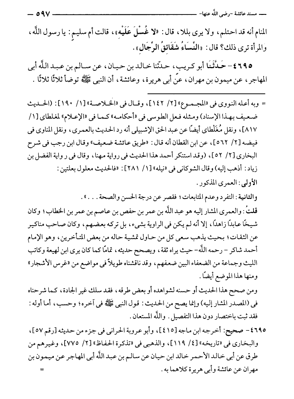 قلتُ: والعمرى المشار إليه هو عبد الله بن عمر بن حفص بن عاصم بن عمر بن الخطاب؛ وكان شيخًا عابدًا زاهدًا، إلا أنه لم يكن في الراوية بشئ، بل تركه بعضهم، وكان صاحب مناكير عن الثقات؛ بحيث يذهب سعى كل من حاول تمشية حاله من بعض المتأخرين، وهو الإمام أحمد شاكر - رحمه الله - حيث يراه ثقة، ويصحح حديثه، تمامًا كما كان يرى ابن لهيعة وكاتب الليث وجماعة من الضعفاء البين ضعفهم، وقد ناقشناه طويلًا في مواضع من "غرس الأشجار" ومنها هذا الموضع أيضًا.